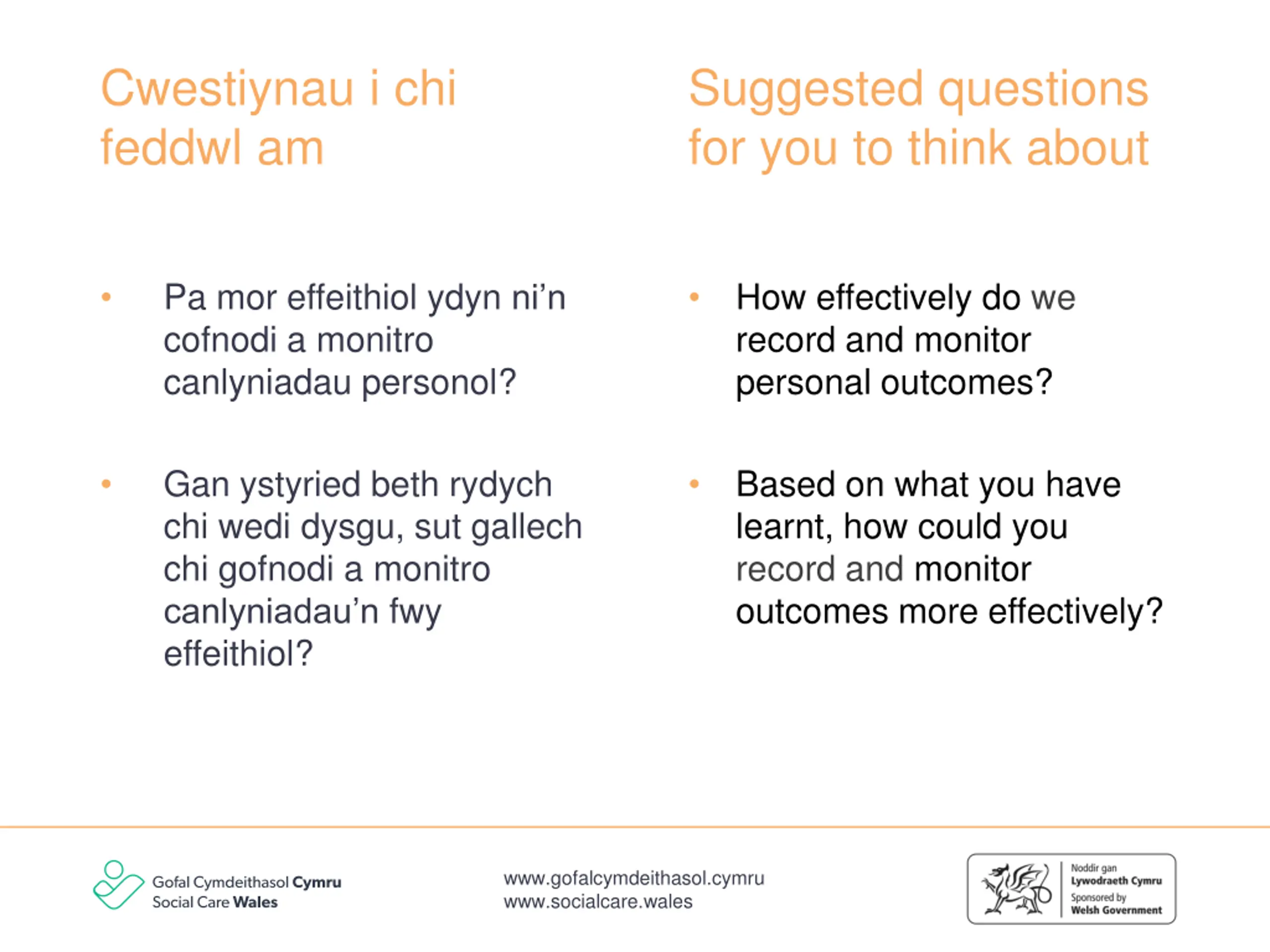 Cwestiynau i chi feddwl am Suggested questions for you to think about Pa mor effeithiol ydyn ni n cofnodi a monitro canlyniadau personol? How effectively do we record and monitor personal outcomes? Gan ystyried beth rydych chi wedi dysgu, sut gallech chi gofnodi a monitro canlyniadau n fwy effeithiol? Based on what you have learnt, how could you record and monitor outcomes more effectively? www.gofalcymdeithasol.cymru www.socialcare.wales