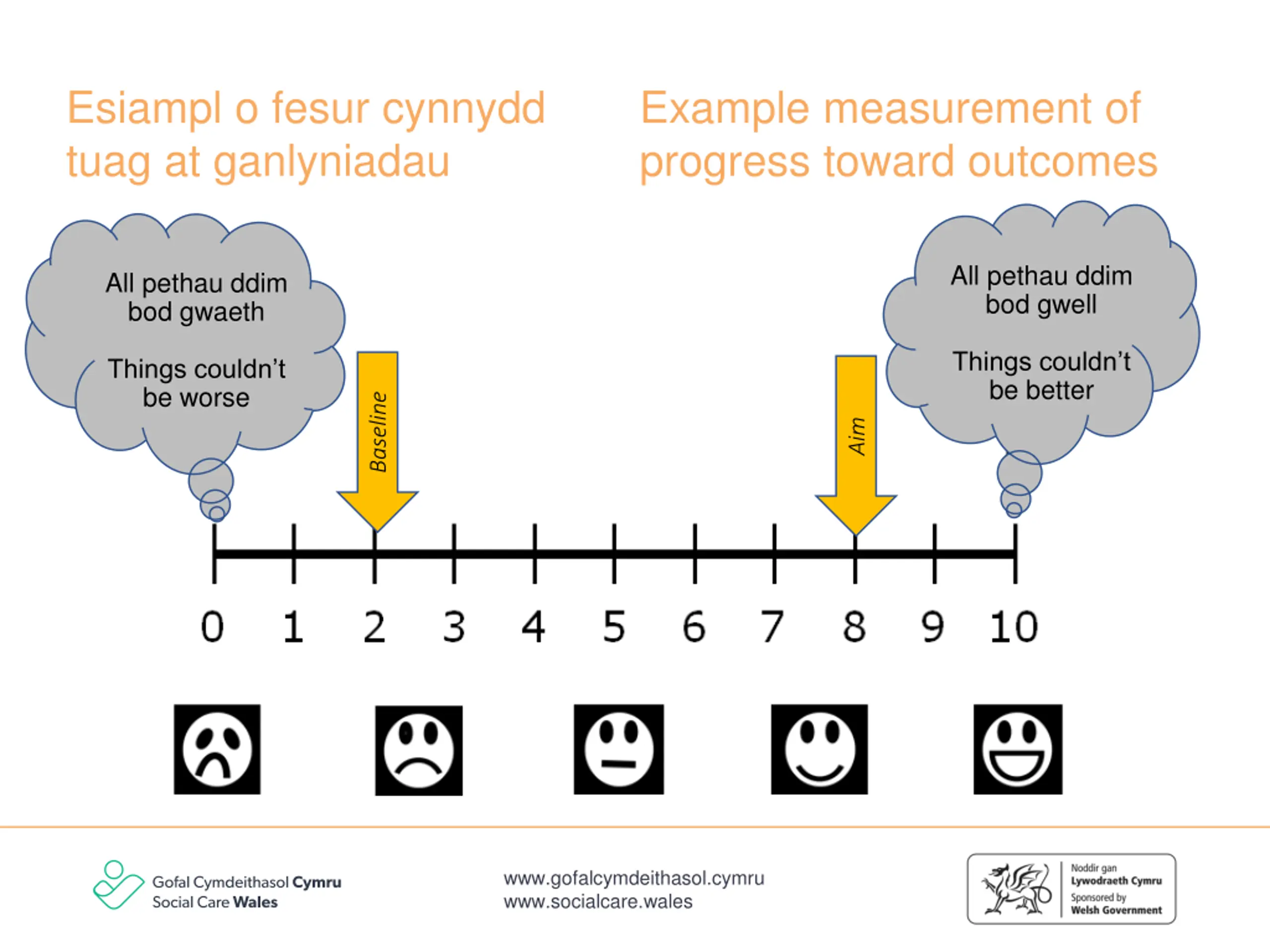 Esiampl o fesur cynnydd tuag at ganlyniadau Example measurement of progress toward outcomes All pethau ddim bod gwell All pethau ddim bod gwaeth Things couldn t be better Things couldn t be worse Baseline Aim www.gofalcymdeithasol.cymru www.socialcare.wales
