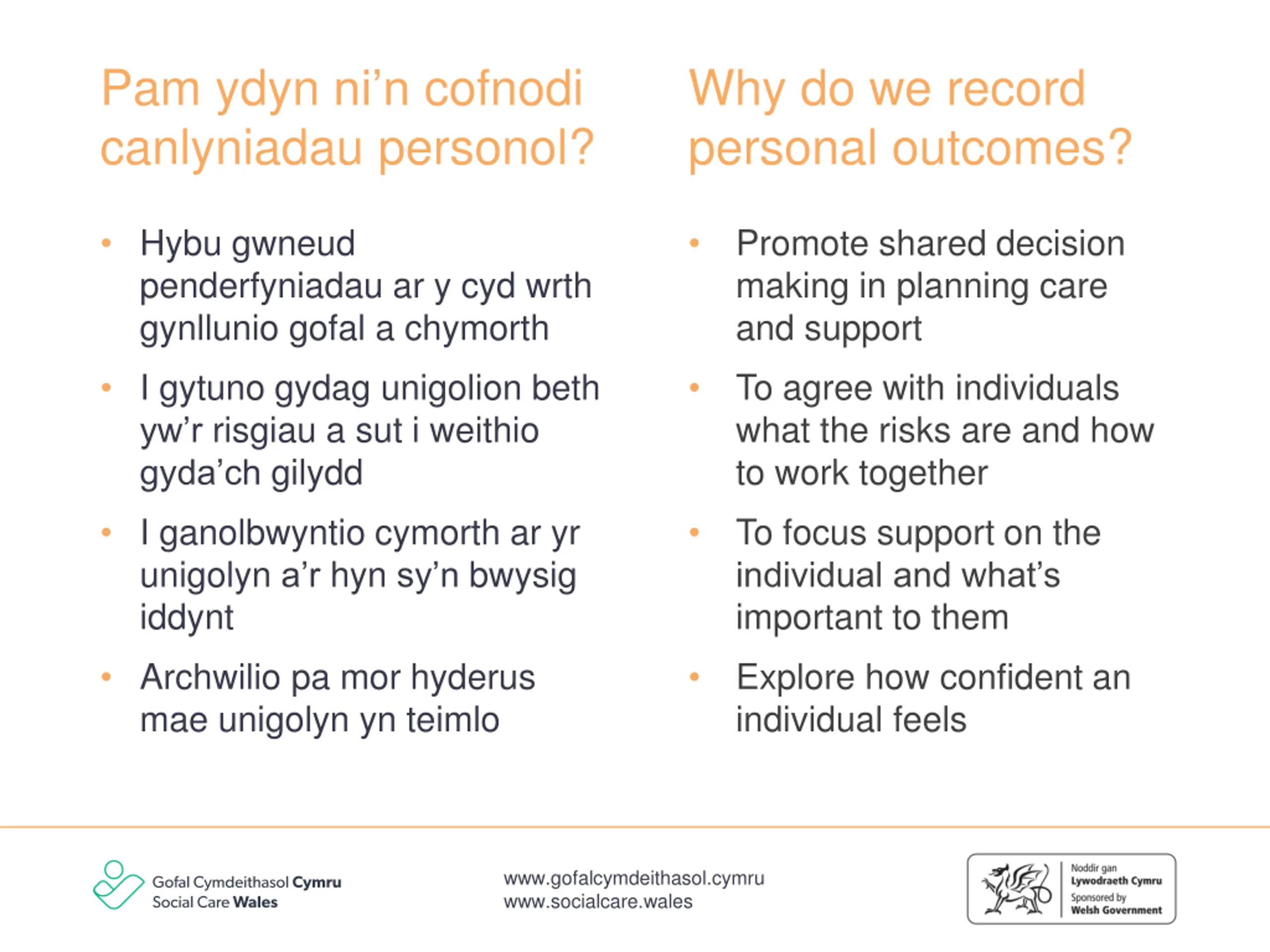 Pam ydyn nin cofnodi canlyniadau personol? Why do we record personal outcomes? Hybu gwneud penderfyniadau ar y cyd wrth gynllunio gofal a chymorth Promote shared decision making in planning care and support I gytuno gydag unigolion beth yw r risgiau a sut i weithio gyda ch gilydd To agree with individuals what the risks are and how to work together I ganolbwyntio cymorth ar yr unigolyn a r hyn sy n bwysig iddynt To focus support on the individual and what s important to them Archwilio pa mor hyderus mae unigolyn yn teimlo Explore how confident an individual feels www.gofalcymdeithasol.cymru www.socialcare.wales