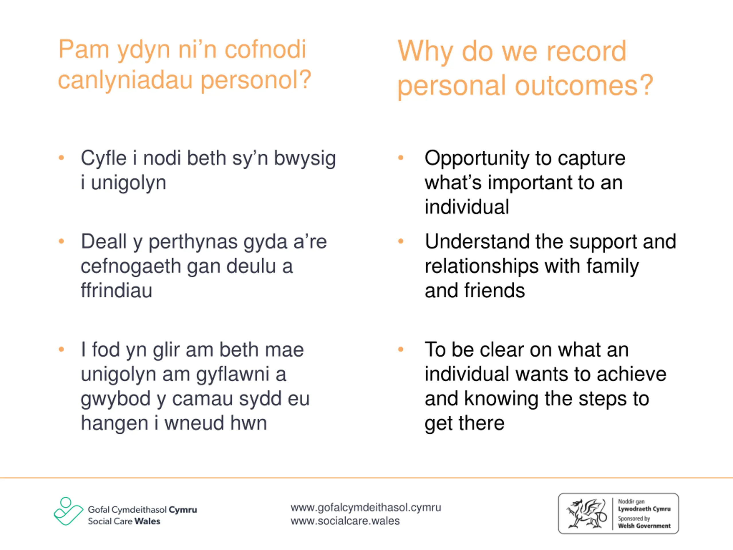 Pam ydyn nin cofnodi canlyniadau personol? Why do we record personal outcomes? Cyfle i nodi beth sy n bwysig i unigolyn Opportunity to capture what s important to an individual Deall y perthynas gyda a re cefnogaeth gan deulu a ffrindiau Understand the support and relationships with family and friends I fod yn glir am beth mae unigolyn am gyflawni a gwybod y camau sydd eu hangen i wneud hwn To be clear on what an individual wants to achieve and knowing the steps to get there www.gofalcymdeithasol.cymru www.socialcare.wales