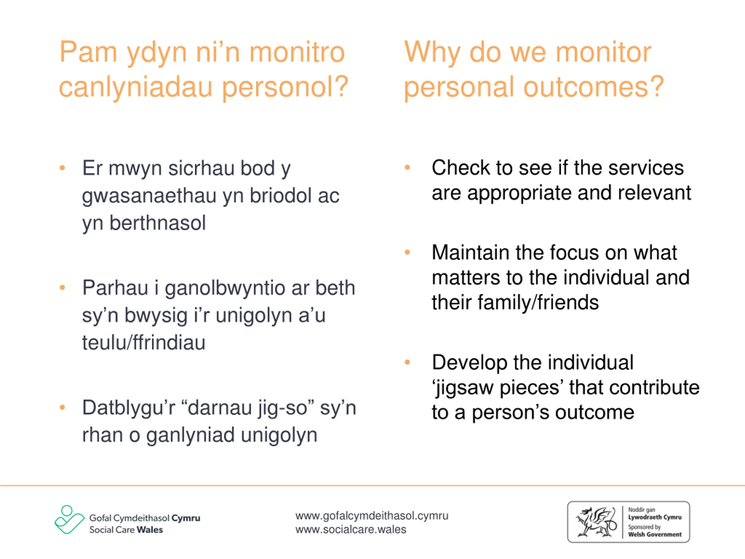 Pam ydyn nin monitro canlyniadau personol? Why do we monitor personal outcomes? Check to see if the services are appropriate and relevant Er mwyn sicrhau bod y gwasanaethau yn briodol ac yn berthnasol Maintain the focus on what matters to the individual and their family/friends Parhau i ganolbwyntio ar beth sy n bwysig i r unigolyn a u teulu/ffrindiau Develop the individual jigsaw pieces that contribute to a person s outcome Datblygu r darnau jig-so sy n rhan o ganlyniad unigolyn www.gofalcymdeithasol.cymru www.socialcare.wales
