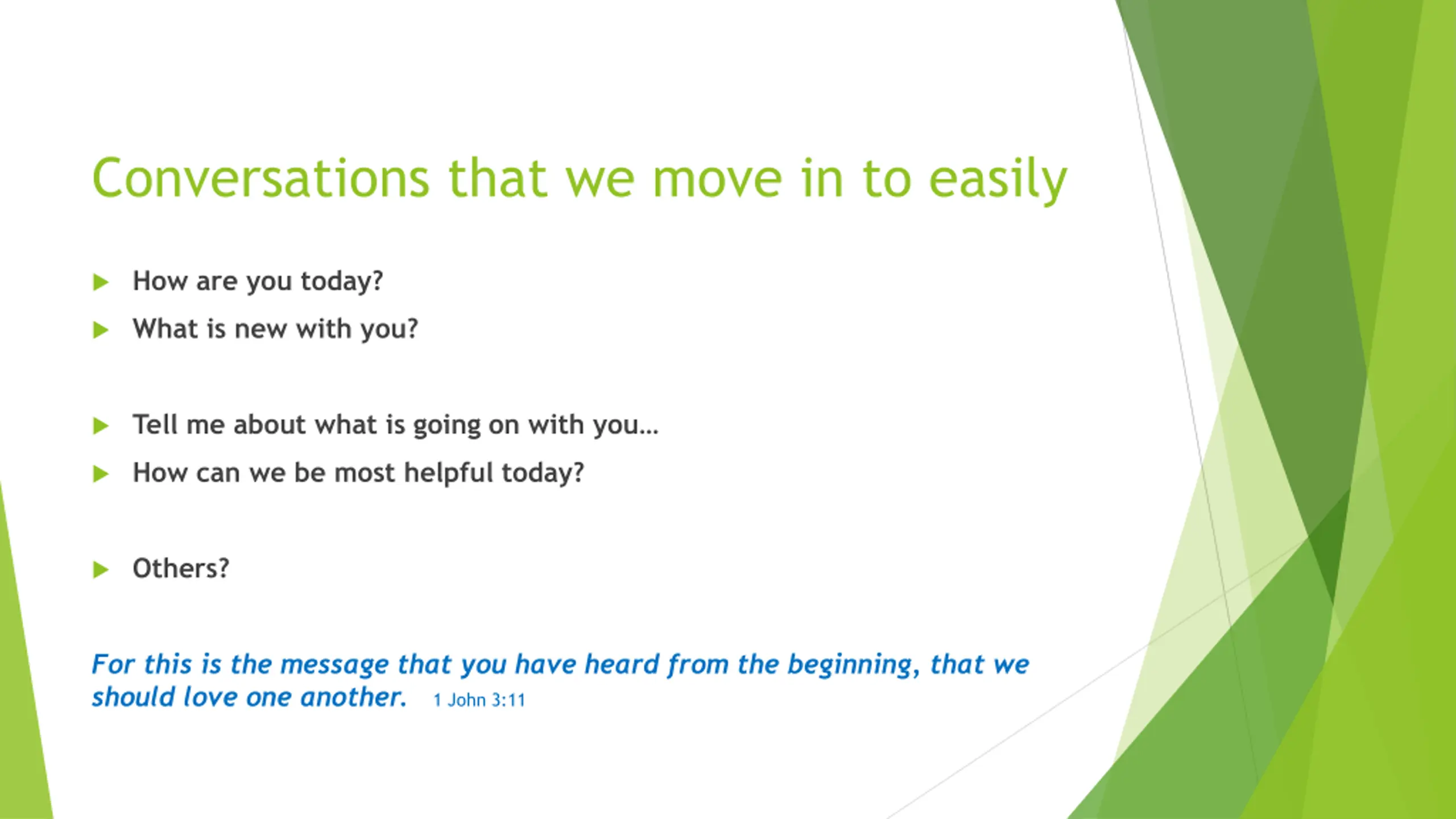 Conversations that we move in to easily How are you today? What is new with you? Tell me about what is going on with you How can we be most helpful today? Others? For this is the message that you have heard from the beginning, that we should love one another. 1 John 3:11