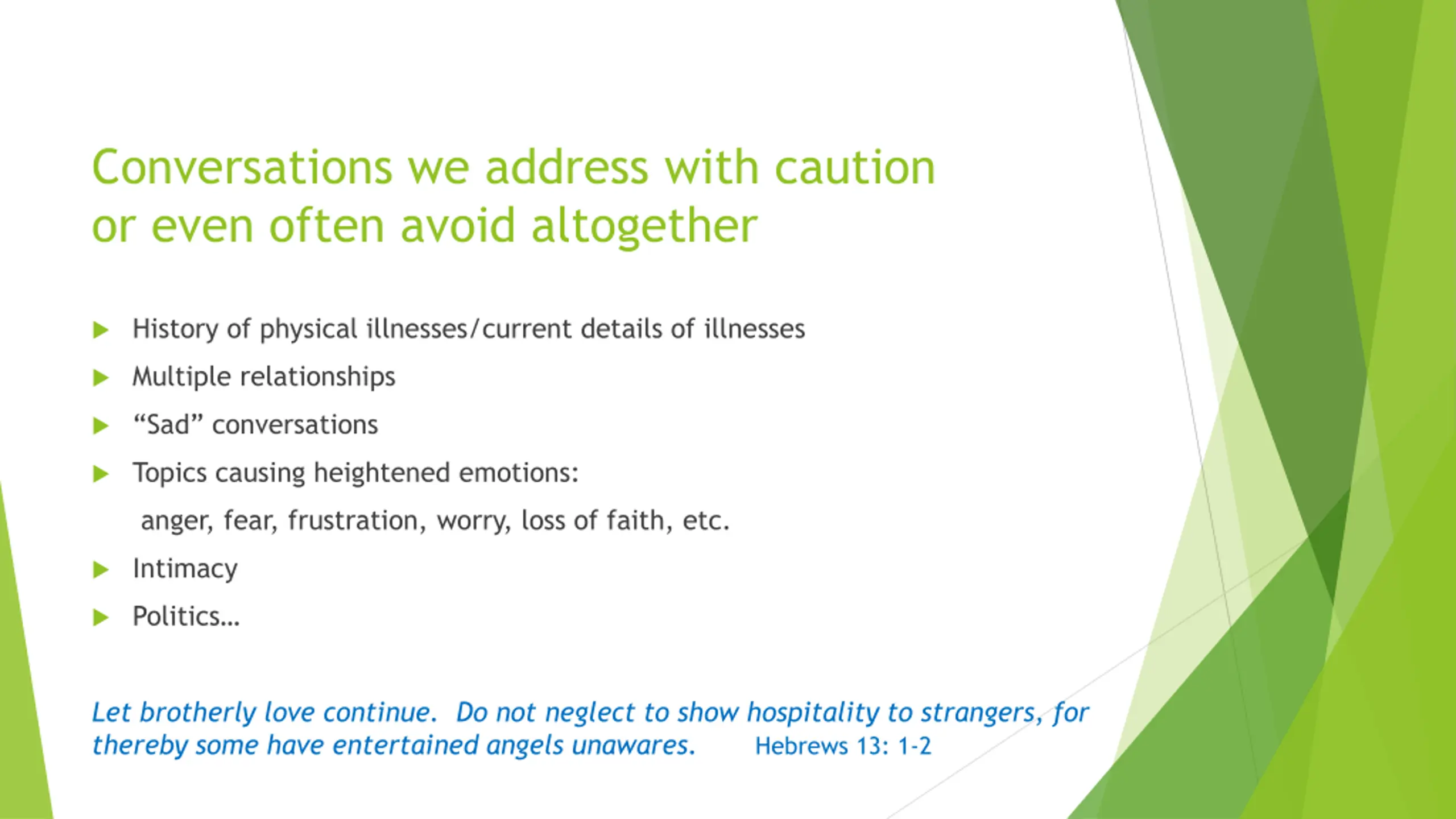 Conversations we address with caution or even often avoid altogether History of physical illnesses/current details of illnesses Multiple relationships Sad conversations Topics causing heightened emotions: anger, fear, frustration, worry, loss of faith, etc. Intimacy Politics Let brotherly love continue. Do not neglect to show hospitality to strangers, for thereby some have entertained angels unawares. Hebrews 13: 1-2