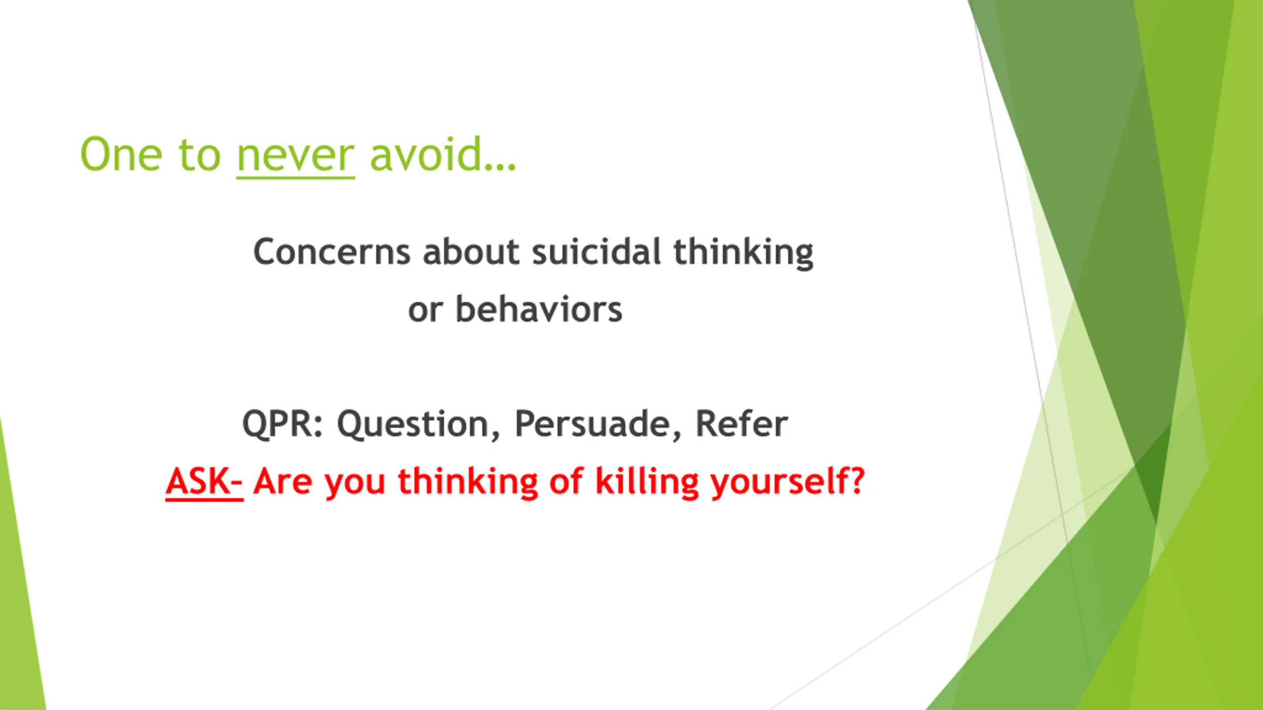 One to never avoid Concerns about suicidal thinking or behaviors QPR: Question, Persuade, Refer ASK Are you thinking of killing yourself?