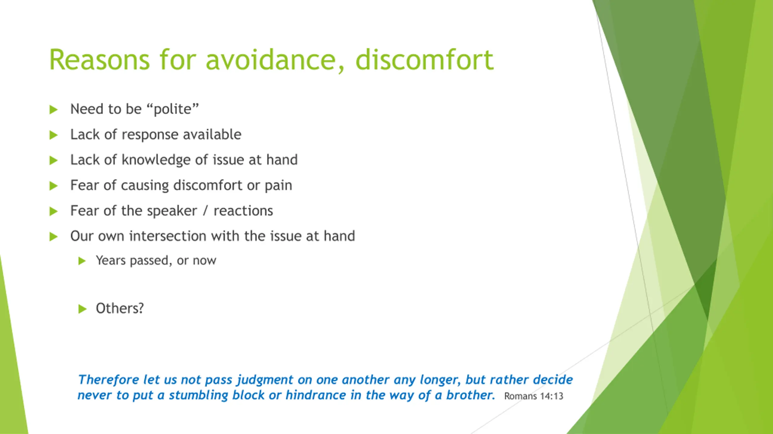Reasons for avoidance, discomfort Need to be polite Lack of response available Lack of knowledge of issue at hand Fear of causing discomfort or pain Fear of the speaker / reactions Our own intersection with the issue at hand Years passed, or now Others? Therefore let us not pass judgment on one another any longer, but rather decide never to put a stumbling block or hindrance in the way of a brother. Romans 14:13