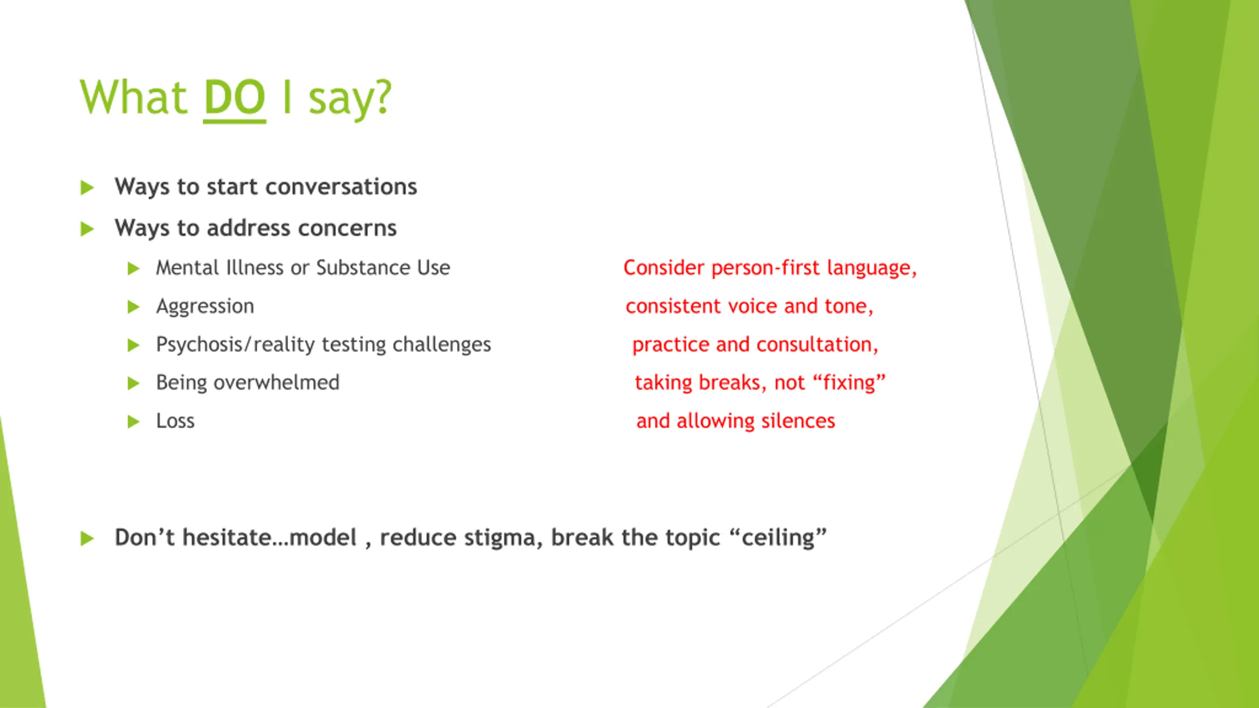 What DO I say? Ways to start conversations Ways to address concerns Mental Illness or Substance Use Consider person-first language, Aggression consistent voice and tone, Psychosis/reality testing challenges practice and consultation, Being overwhelmed taking breaks, not fixing Loss and allowing silences Don t hesitate model , reduce stigma, break the topic ceiling