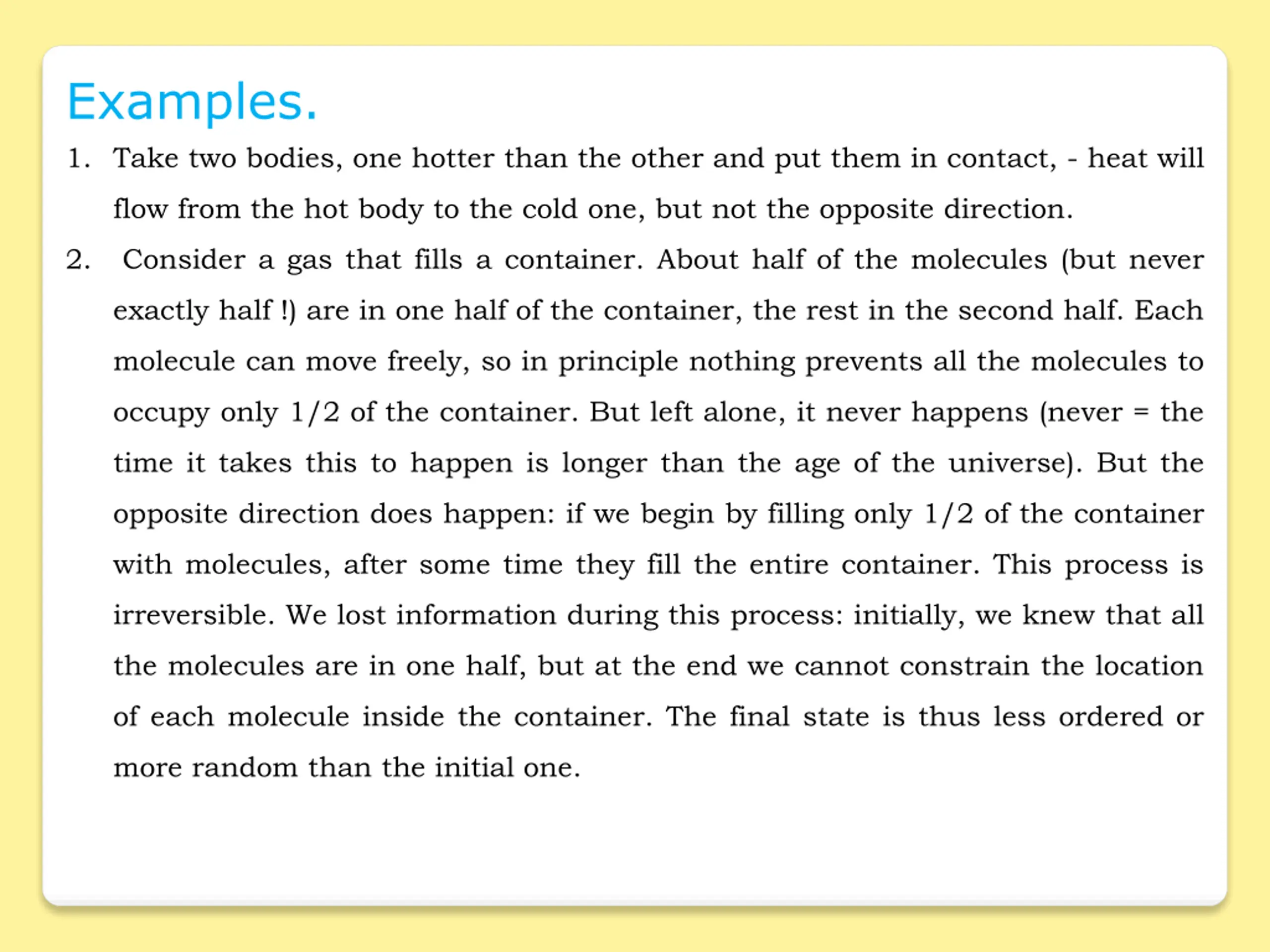 Examples. 1. Take two bodies, one hotter than the other and put them in contact, - heat will flow from the hot body to the cold one, but not the opposite direction. 2. Consider a gas that fills a container. About half of the molecules (but never exactly half !) are in one half of the container, the rest in the second half. Each molecule can move freely, so in principle nothing prevents all the molecules to occupy only 1/2 of the container. But left alone, it never happens (never = the time it takes this to happen is longer than the age of the universe). But the opposite direction does happen: if we begin by filling only 1/2 of the container with molecules, after some time they fill the entire container. This process is irreversible. We lost information during this process: initially, we knew that all the molecules are in one half, but at the end we cannot constrain the location of each molecule inside the container. The final state is thus less ordered or more random than the initial one.