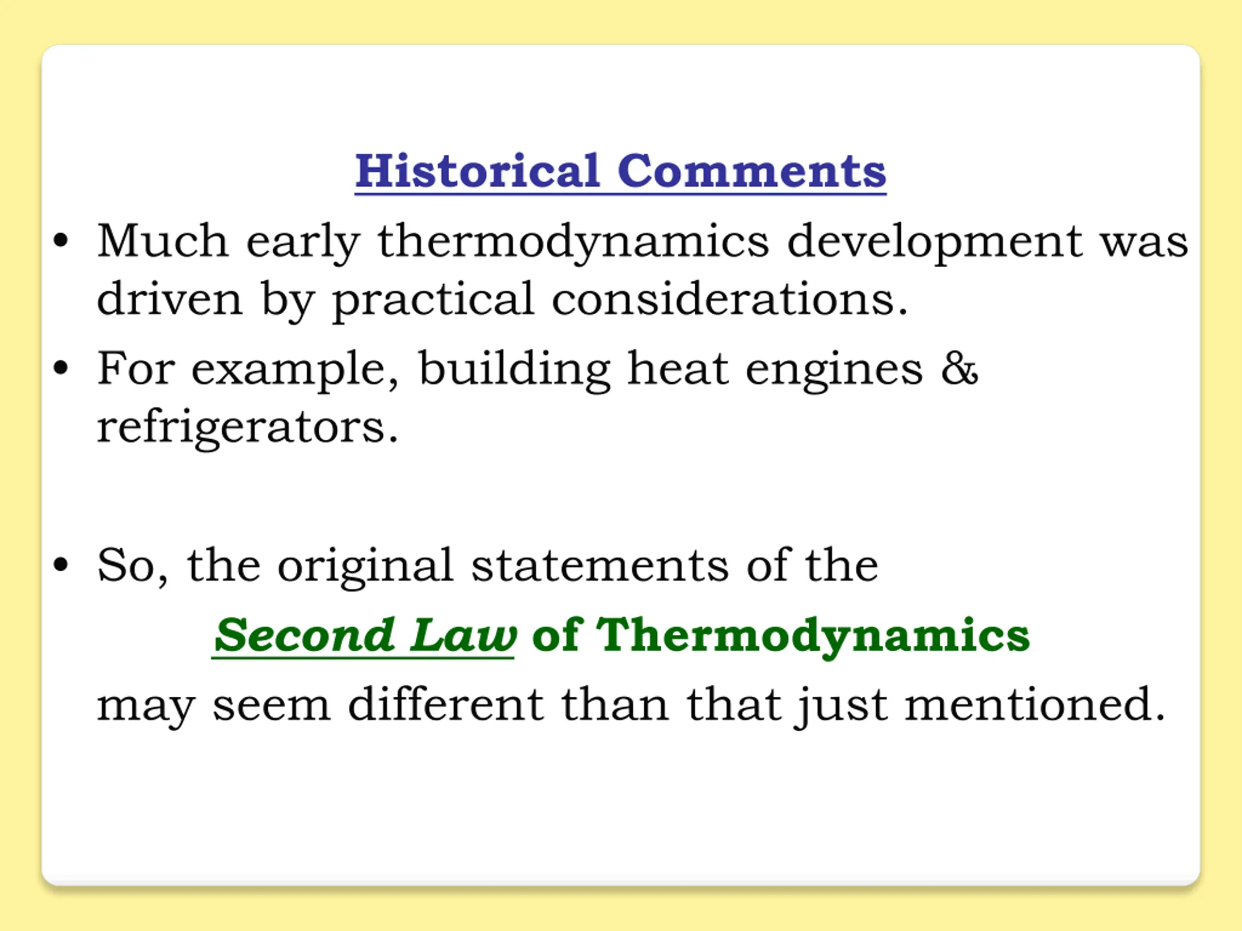 Historical Comments Much early thermodynamics development was driven by practical considerations. For example, building heat engines & refrigerators. So, the original statements of the Second Law of Thermodynamics may seem different than that just mentioned.