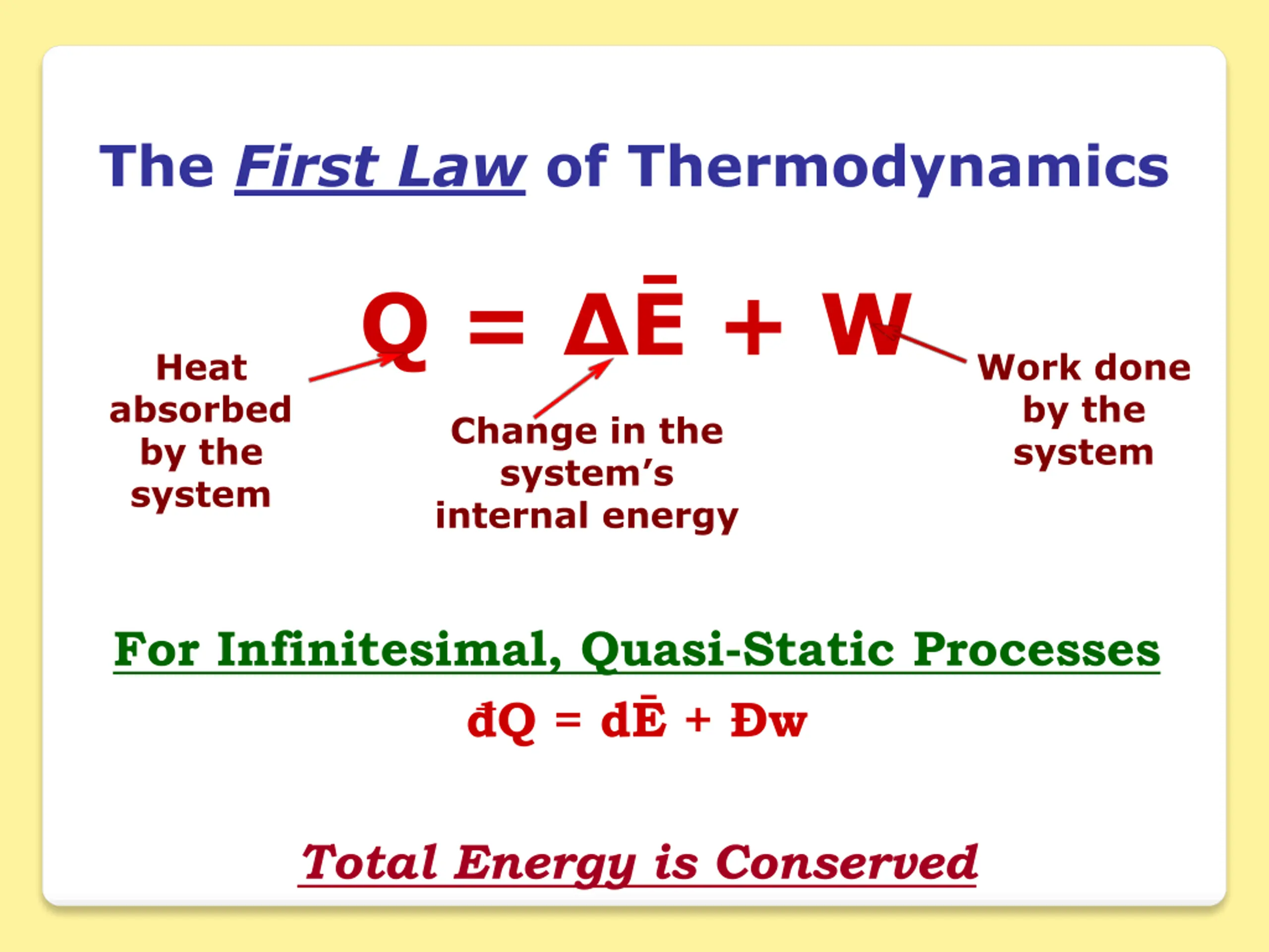 The First Law of Thermodynamics Q = + W Heat absorbed by the system Work done by the system Change in the system s internal energy For Infinitesimal, Quasi-Static Processes Q = d + w Total Energy is Conserved