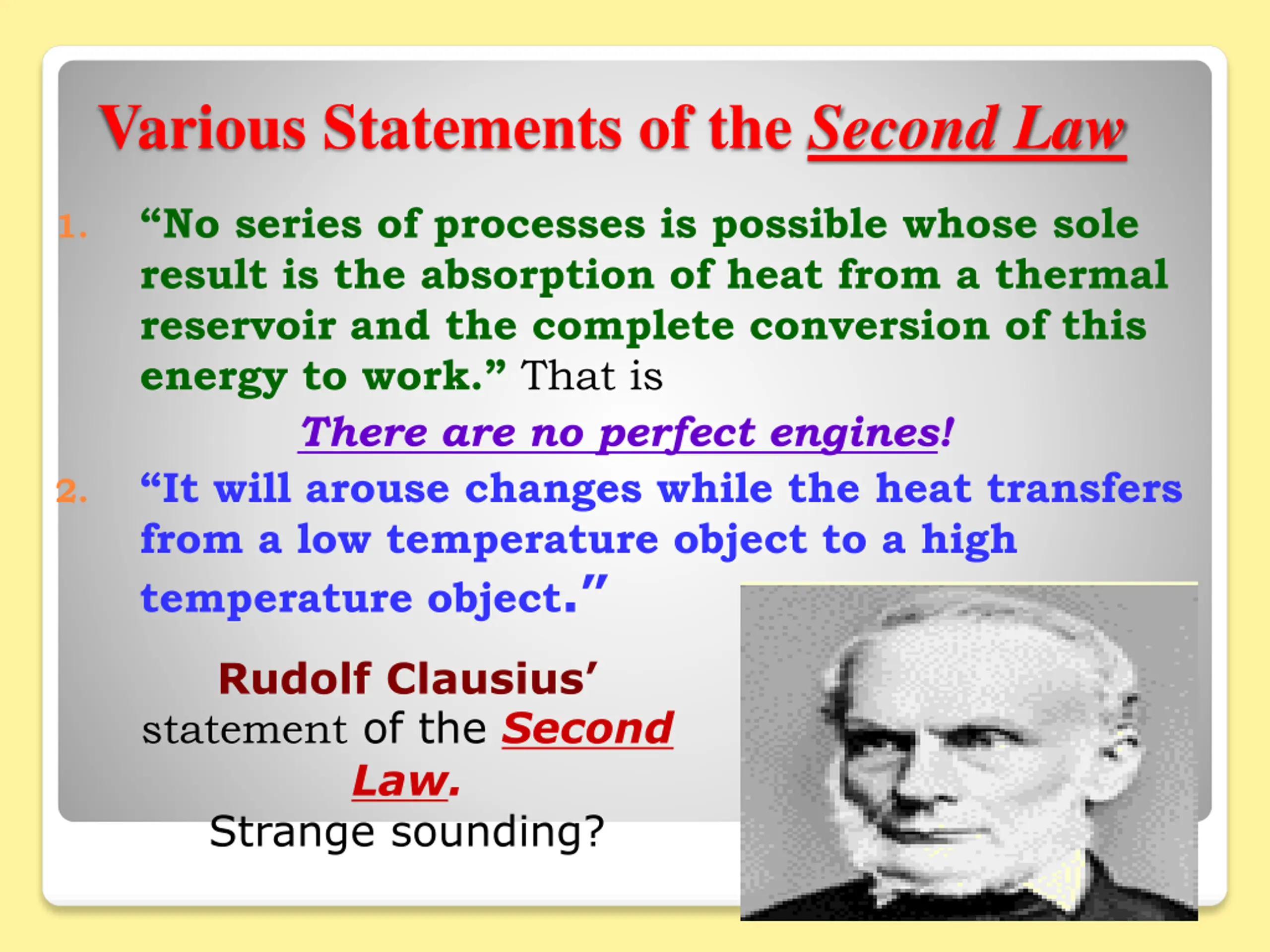 Various Statements of the Second Law No series of processes is possible whose sole result is the absorption of heat from a thermal reservoir and the complete conversion of this energy to work. That is There are no perfect engines! It will arouse changes while the heat transfers from a low temperature object to a high temperature object. 1. 2. Rudolf Clausius statement of the Second Law. Strange sounding?