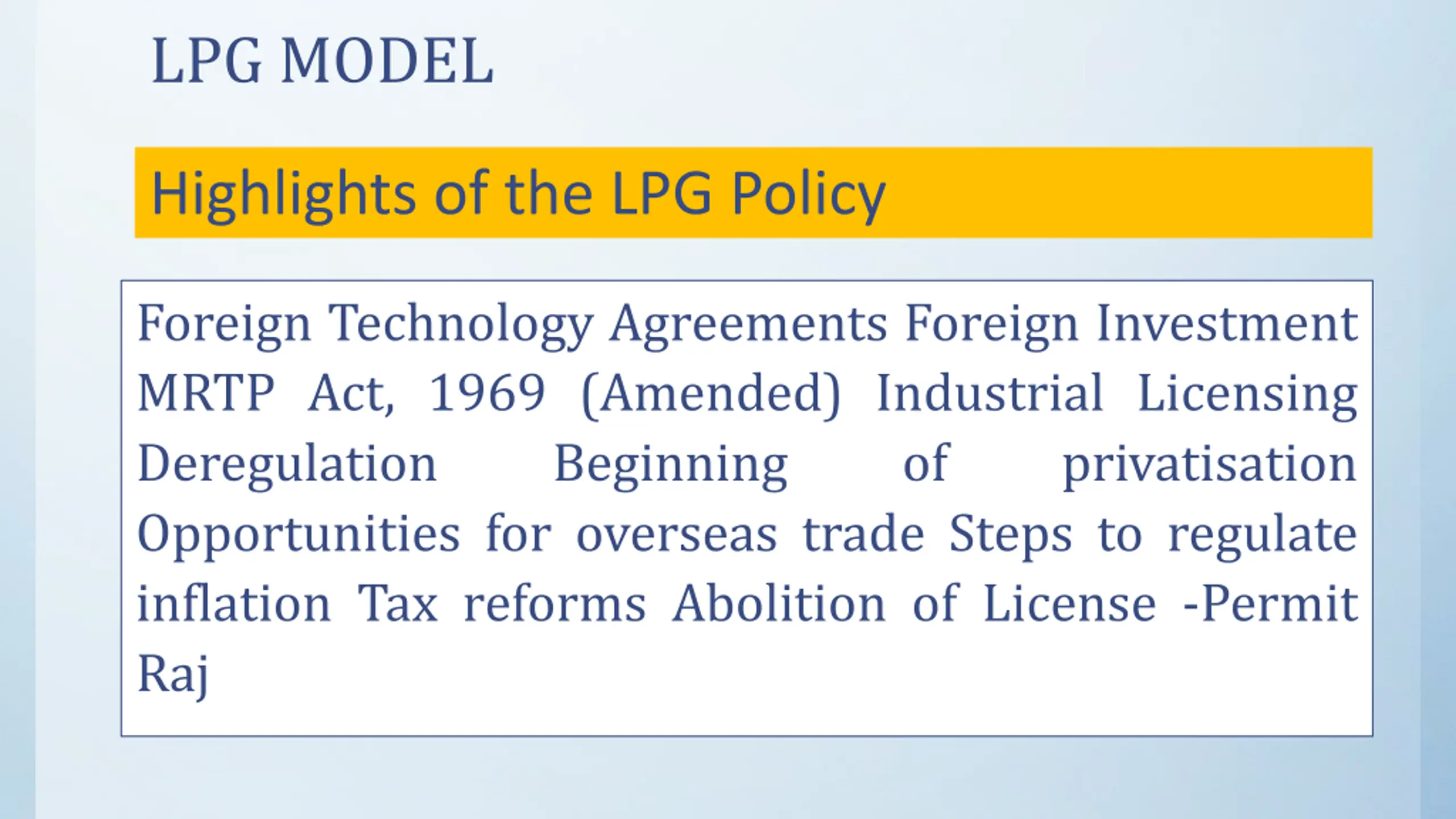 LPG MODEL Highlights of the LPG Policy Foreign Technology Agreements Foreign Investment MRTP Act, 1969 (Amended) Industrial Licensing Deregulation Beginning Opportunities for overseas trade Steps to regulate inflation Tax reforms Abolition of License -Permit Raj of privatisation