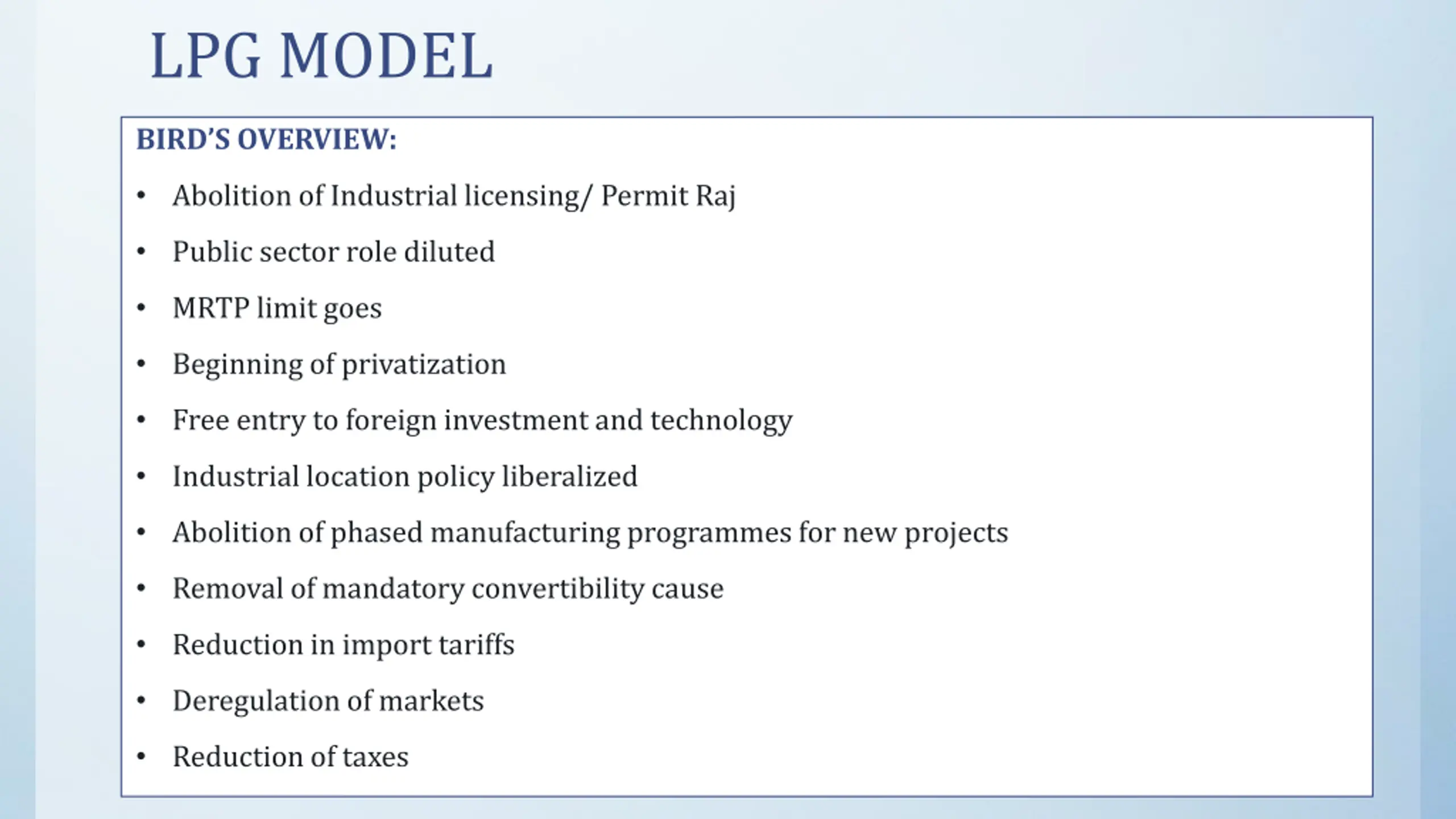 LPG MODEL BIRD S OVERVIEW: Abolition of Industrial licensing/ Permit Raj Public sector role diluted MRTP limit goes Beginning of privatization Free entry to foreign investment and technology Industrial location policy liberalized Abolition of phased manufacturing programmes for new projects Removal of mandatory convertibility cause Reduction in import tariffs Deregulation of markets Reduction of taxes