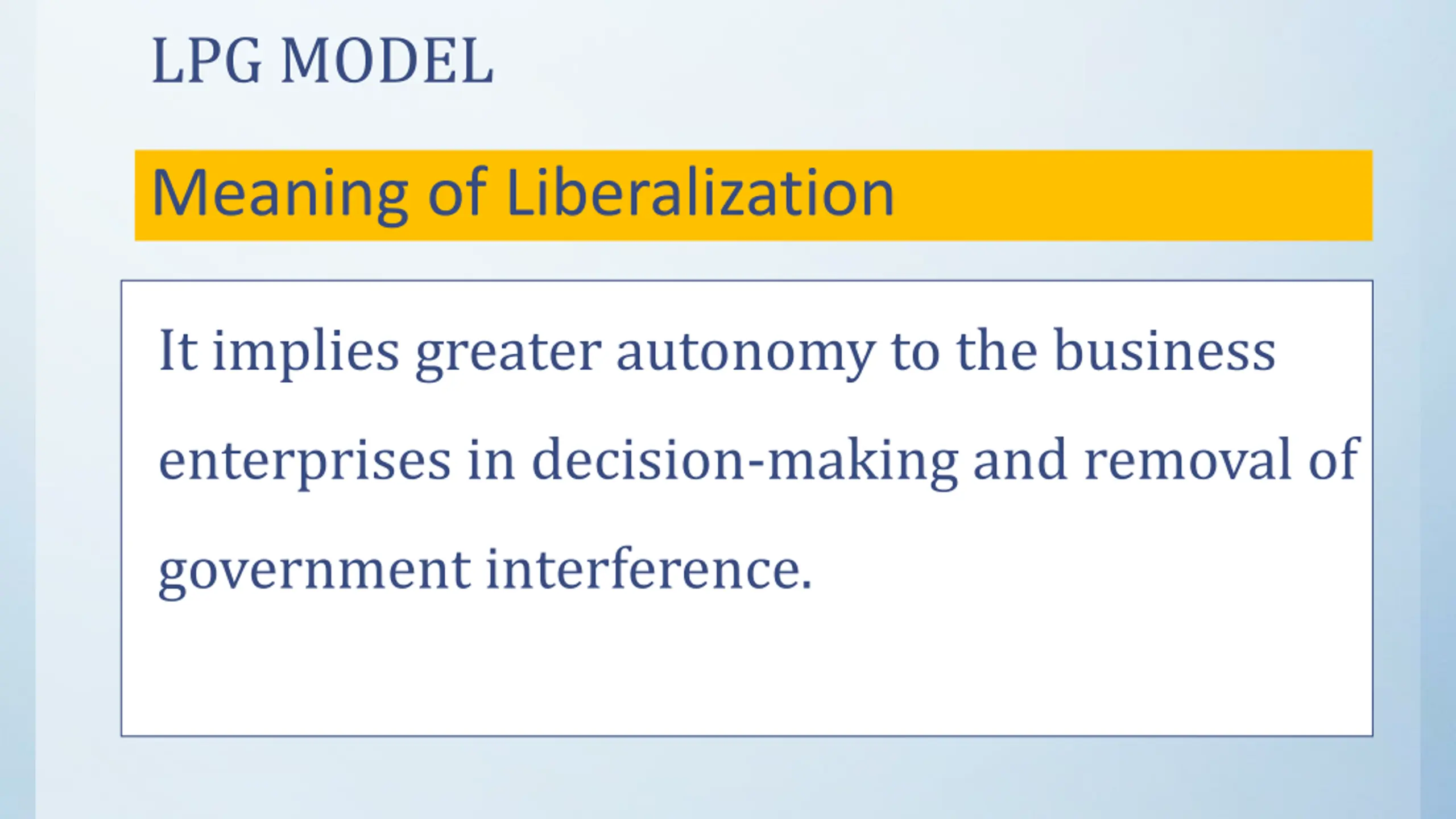 LPG MODEL Meaning of Liberalization It implies greater autonomy to the business enterprises in decision-making and removal of government interference.