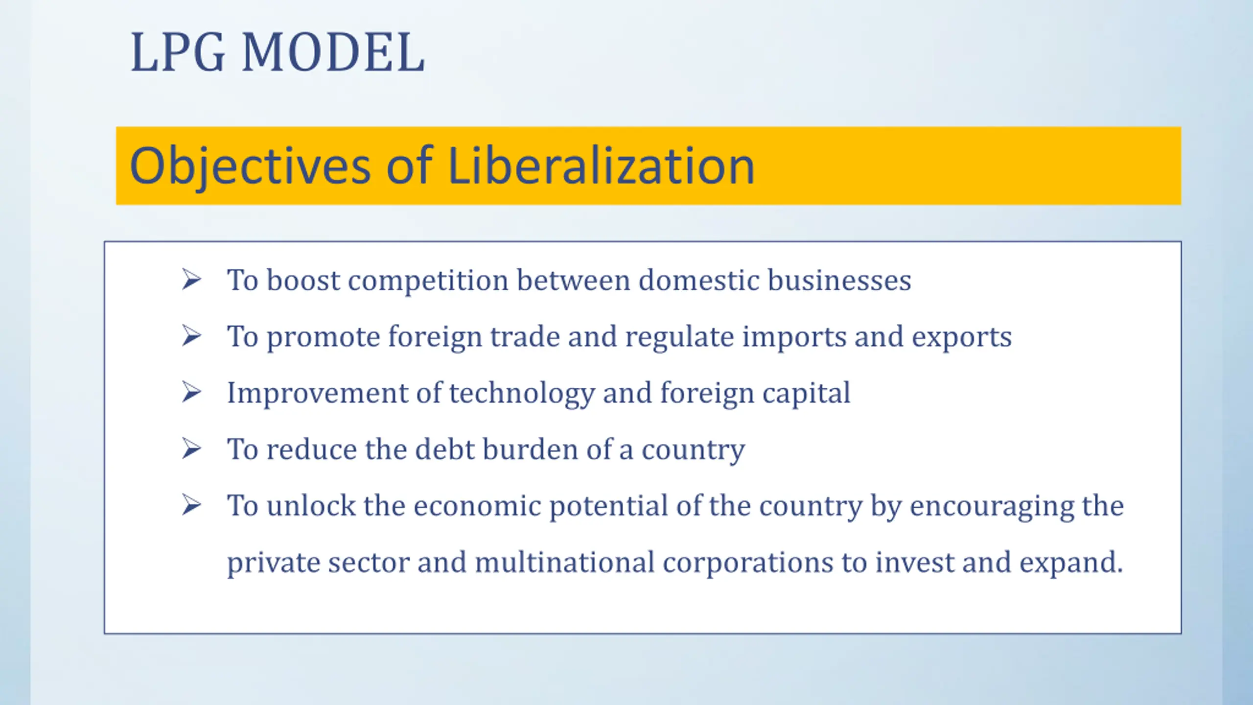 LPG MODEL Objectives of Liberalization To boost competition between domestic businesses To promote foreign trade and regulate imports and exports Improvement of technology and foreign capital To reduce the debt burden of a country To unlock the economic potential of the country by encouraging the private sector and multinational corporations to invest and expand.