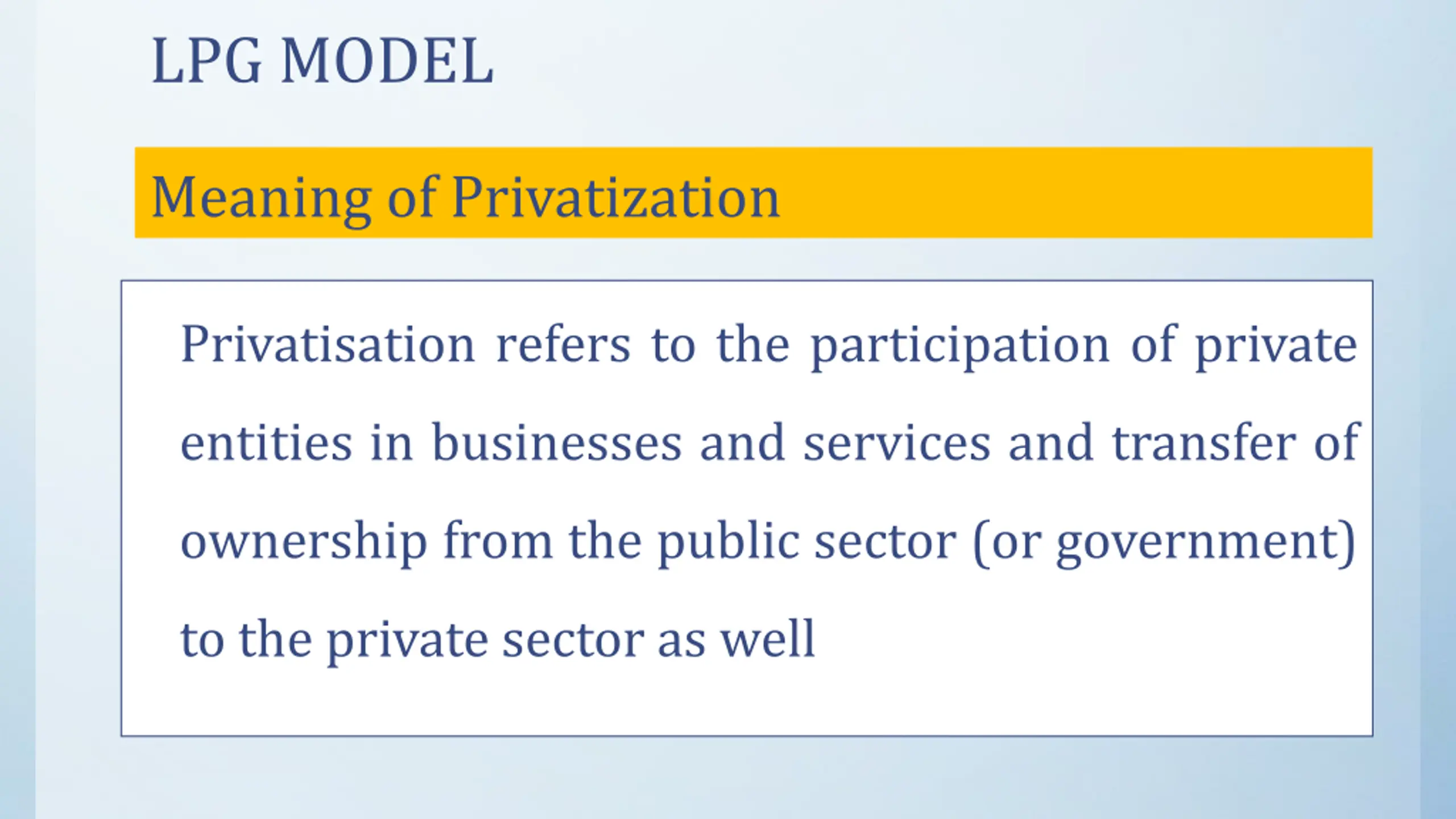 LPG MODEL Meaning of Privatization Privatisation refers to the participation of private entities in businesses and services and transfer of ownership from the public sector (or government) to the private sector as well