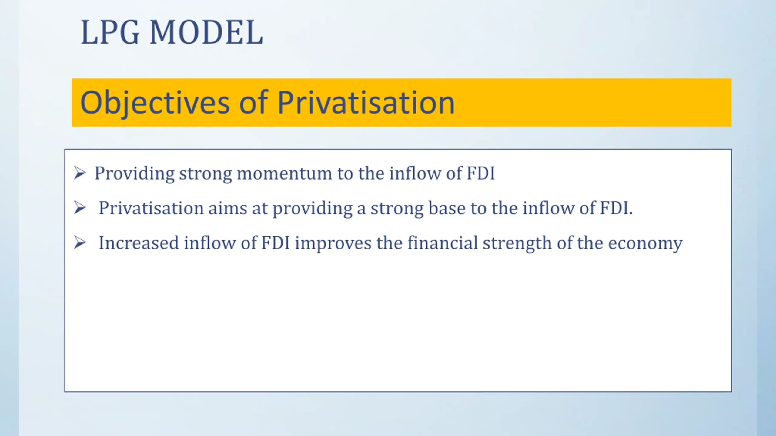 LPG MODEL Objectives of Privatisation Providing strong momentum to the inflow of FDI Privatisation aims at providing a strong base to the inflow of FDI. Increased inflow of FDI improves the financial strength of the economy