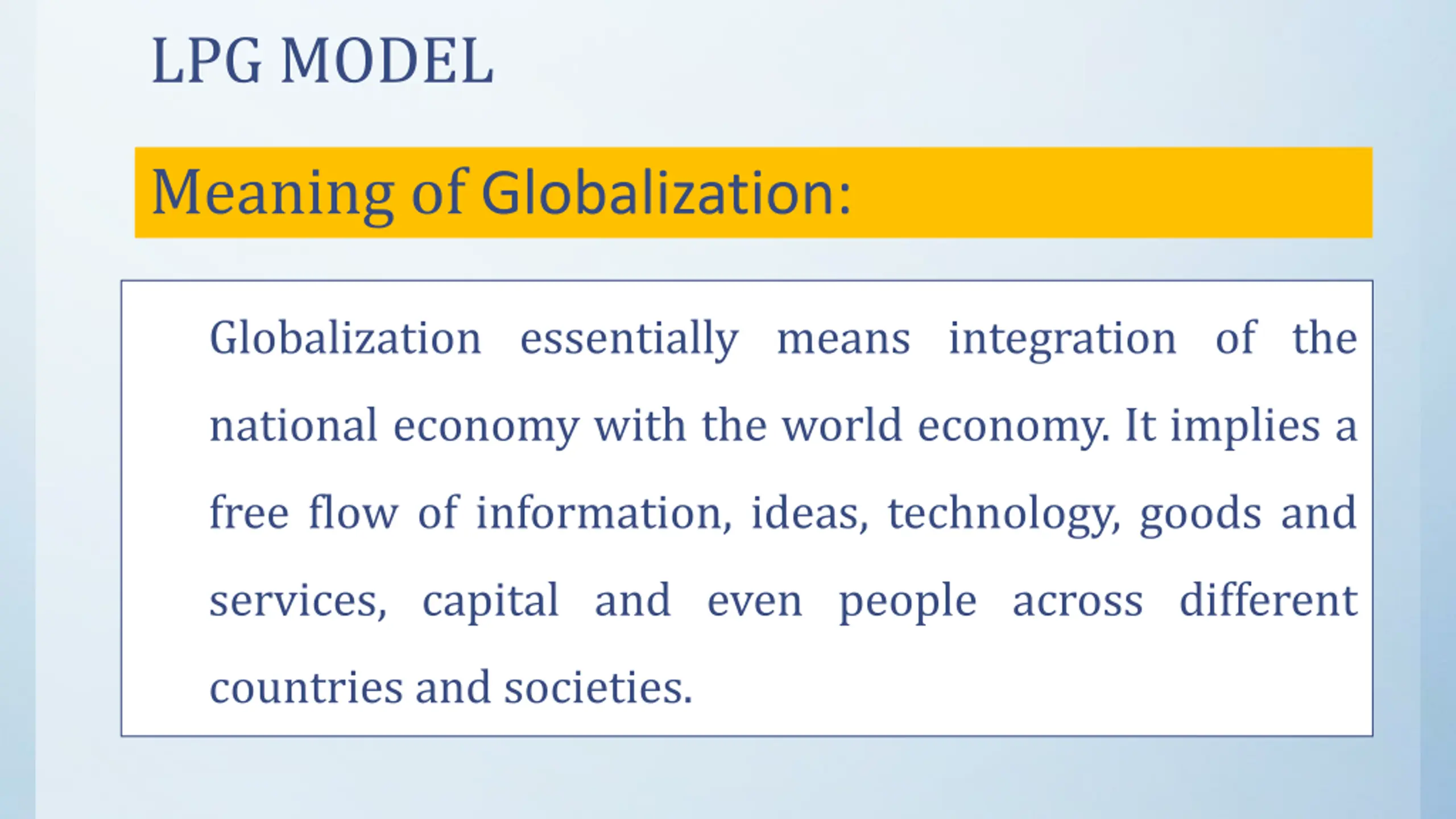 LPG MODEL Meaning of Globalization: Globalization essentially means integration of the national economy with the world economy. It implies a free flow of information, ideas, technology, goods and services, capital and even people across different countries and societies.