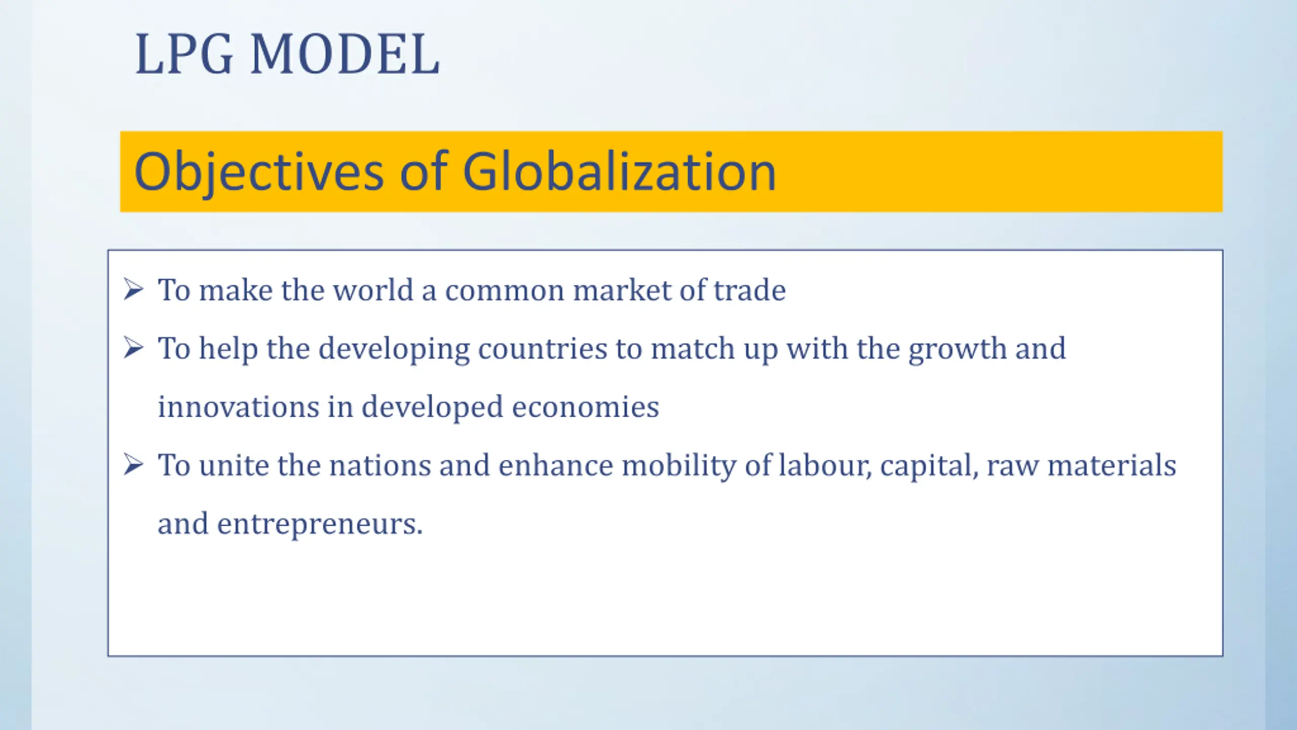 LPG MODEL Objectives of Globalization To make the world a common market of trade To help the developing countries to match up with the growth and innovations in developed economies To unite the nations and enhance mobility of labour, capital, raw materials and entrepreneurs.