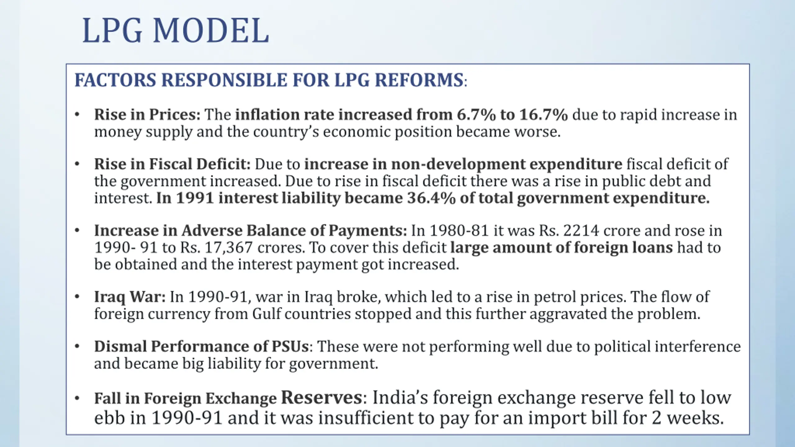 LPG MODEL FACTORS RESPONSIBLE FOR LPG REFORMS: Rise in Prices: The inflation rate increased from 6.7% to 16.7% due to rapid increase in money supply and the country s economic position became worse. Rise in Fiscal Deficit: Due to increase in non-development expenditure fiscal deficit of the government increased. Due to rise in fiscal deficit there was a rise in public debt and interest. In 1991 interest liability became 36.4% of total government expenditure. Increase in Adverse Balance of Payments: In 1980-81 it was Rs. 2214 crore and rose in 1990- 91 to Rs. 17,367 crores. To cover this deficit large amount of foreign loans had to be obtained and the interest payment got increased. Iraq War: In 1990-91, war in Iraq broke, which led to a rise in petrol prices. The flow of foreign currency from Gulf countries stopped and this further aggravated the problem. Dismal Performance of PSUs: These were not performing well due to political interference and became big liability for government. Fall in Foreign Exchange Reserves: India s foreign exchange reserve fell to low ebb in 1990-91 and it was insufficient to pay for an import bill for 2 weeks.