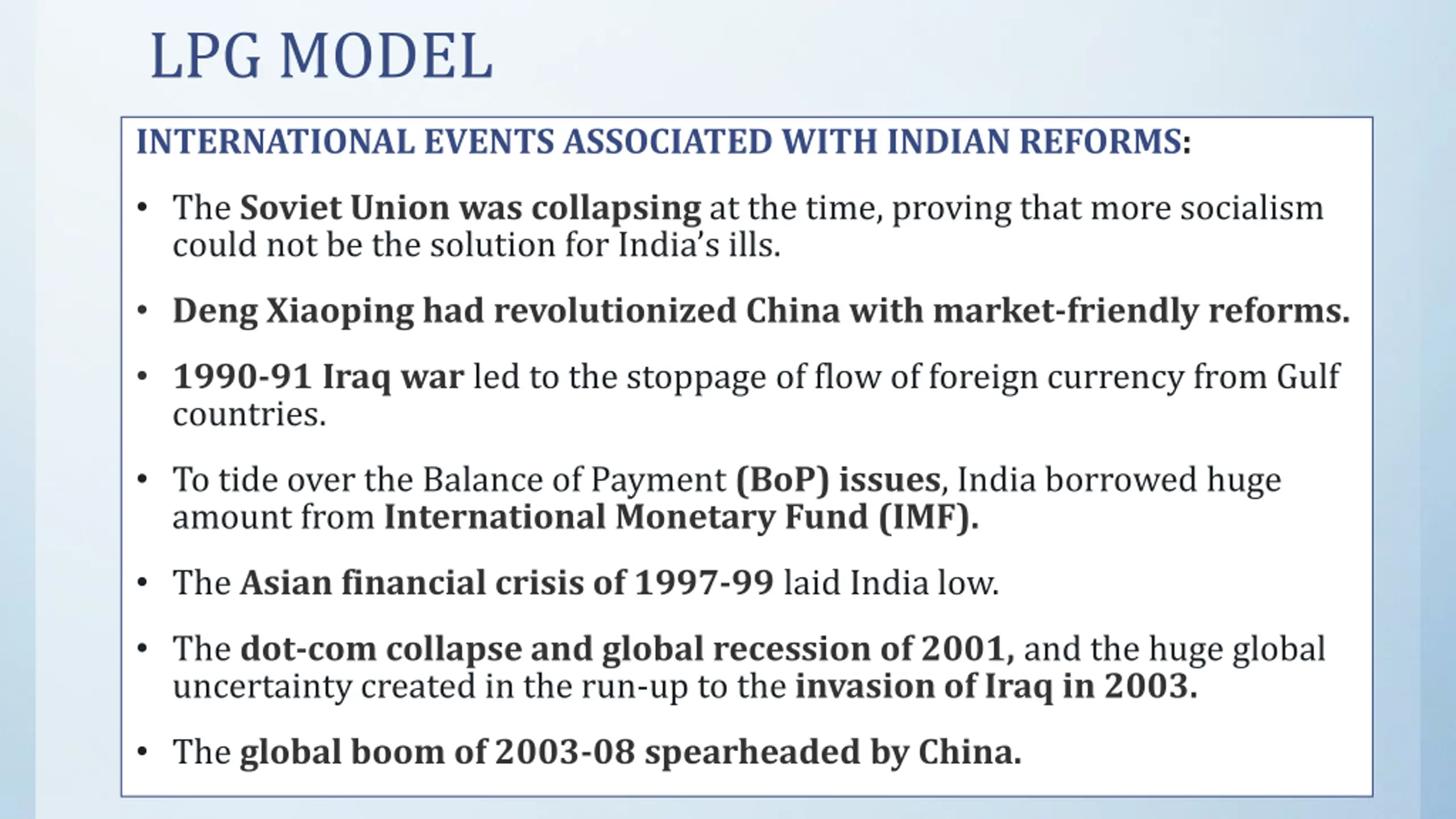 LPG MODEL INTERNATIONAL EVENTS ASSOCIATED WITH INDIAN REFORMS: The Soviet Union was collapsing at the time, proving that more socialism could not be the solution for India s ills. Deng Xiaoping had revolutionized China with market-friendly reforms. 1990-91 Iraq war led to the stoppage of flow of foreign currency from Gulf countries. To tide over the Balance of Payment (BoP) issues, India borrowed huge amount from International Monetary Fund (IMF). The Asian financial crisis of 1997-99 laid India low. The dot-com collapse and global recession of 2001, and the huge global uncertainty created in the run-up to the invasion of Iraq in 2003. The global boom of 2003-08 spearheaded by China.