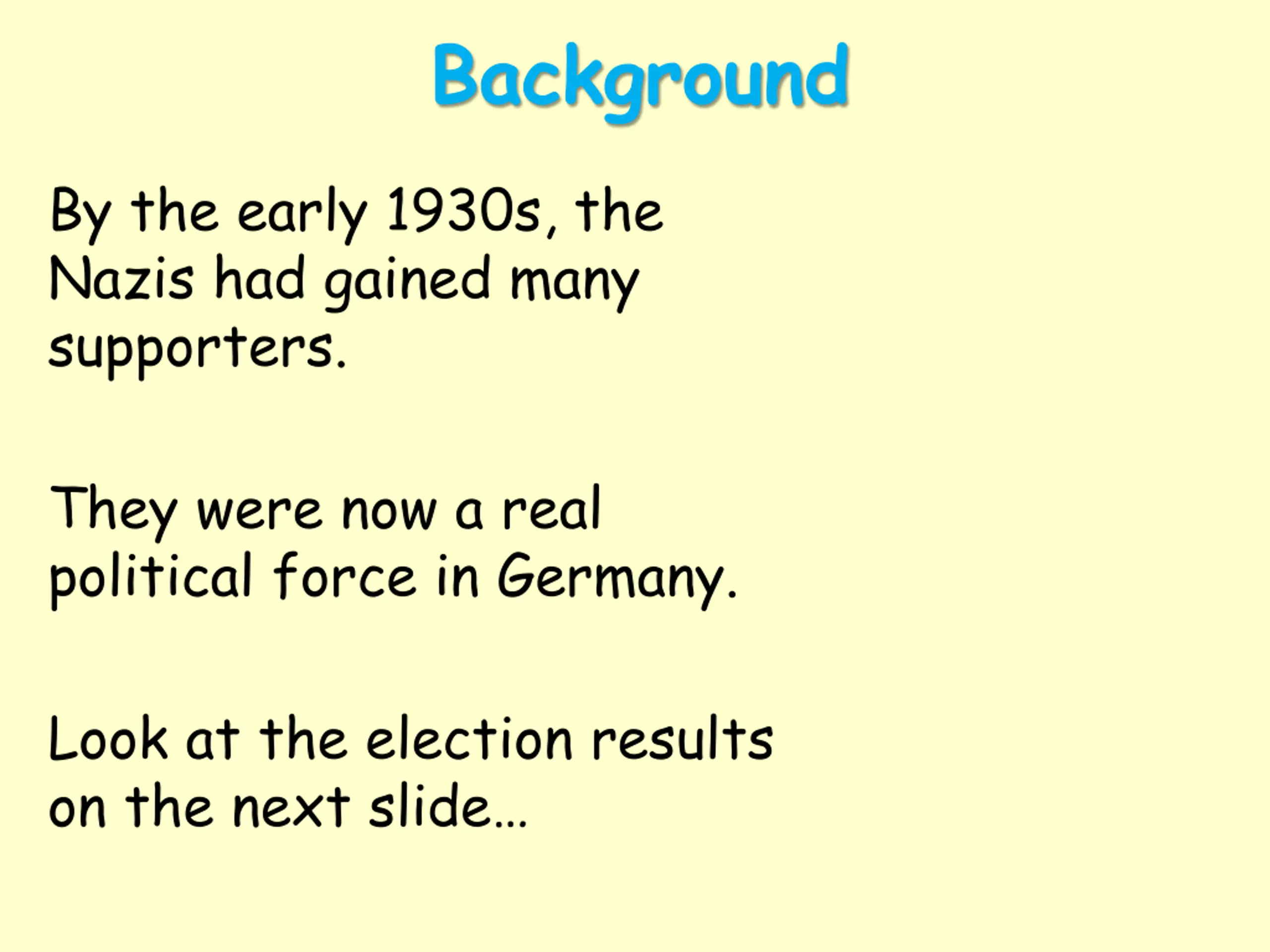 Background By the early 1930s, the Nazis had gained many supporters. They were now a real political force in Germany. Look at the election results on the next slide
