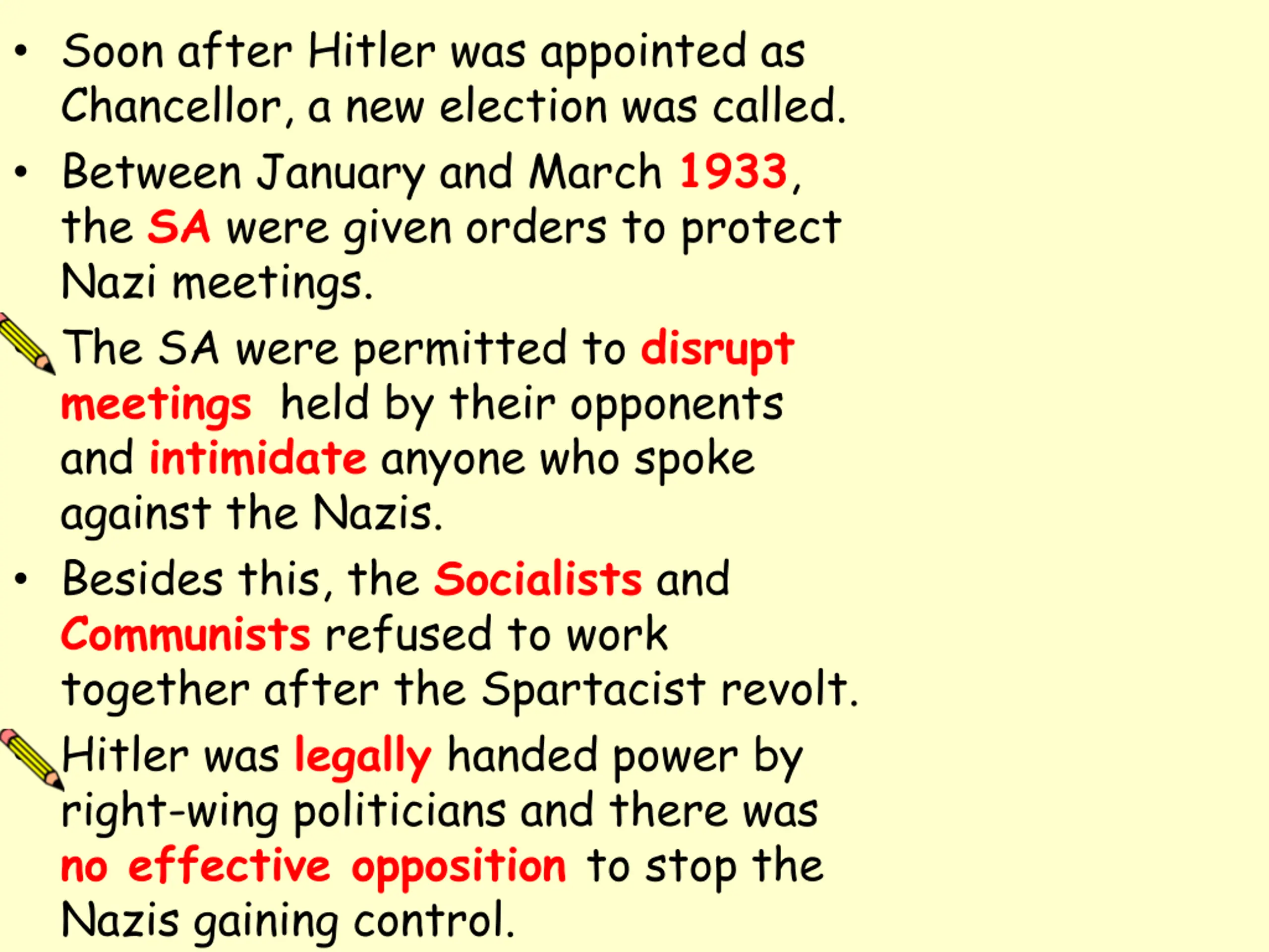 Soon after Hitler was appointed as Chancellor, a new election was called. Between January and March 1933, the SA were given orders to protect Nazi meetings. The SA were permitted to disrupt meetings held by their opponents and intimidate anyone who spoke against the Nazis. Besides this, the Socialists and Communists refused to work together after the Spartacist revolt. Hitler was legally handed power by right-wing politicians and there was no effective opposition to stop the Nazis gaining control.