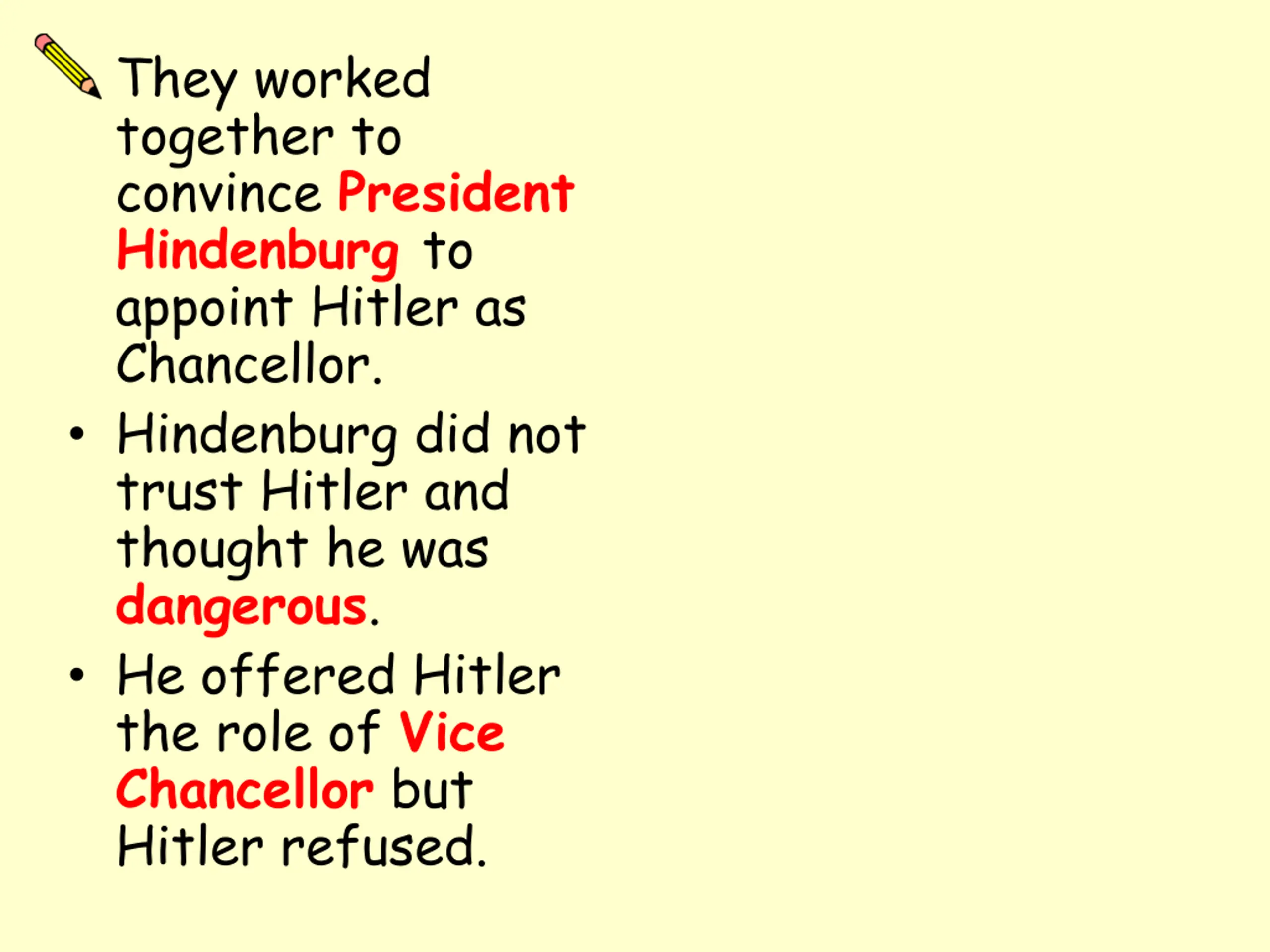 They worked together to convince President Hindenburg to appoint Hitler as Chancellor. Hindenburg did not trust Hitler and thought he was dangerous. He offered Hitler the role of Vice Chancellor but Hitler refused.