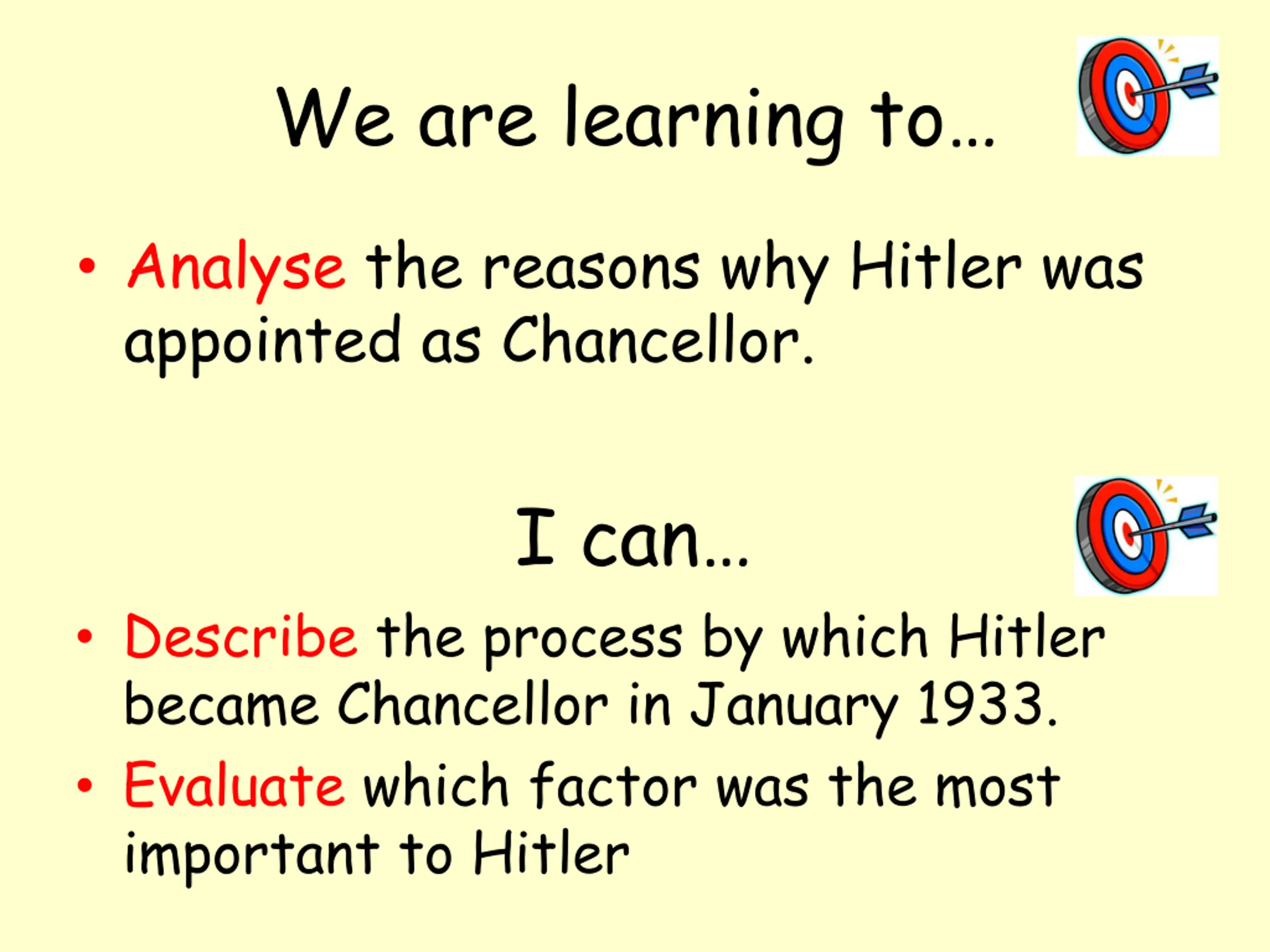 We are learning to Analyse the reasons why Hitler was appointed as Chancellor. I can Describe the process by which Hitler became Chancellor in January 1933. Evaluate which factor was the most important to Hitler