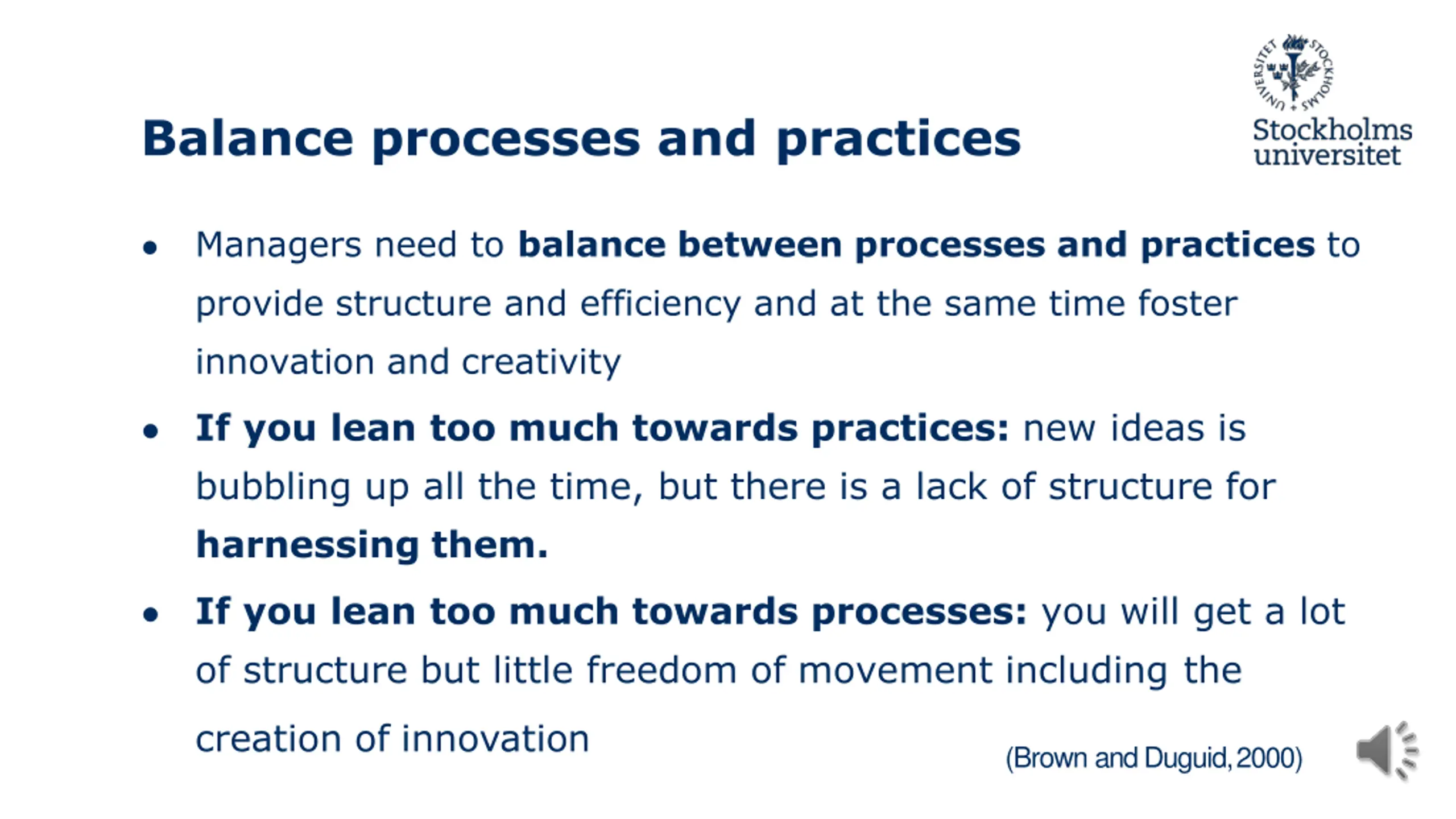 Balance processes and practices Managers need to balance between processes and practices to provide structure and efficiency and at the same time foster innovation and creativity If you lean too much towards practices: new ideas is bubbling up all the time, but there is a lack of structure for harnessing them. If you lean too much towards processes: you will get a lot of structure but little freedom of movement including the creation of innovation (Brown and Duguid,2000)