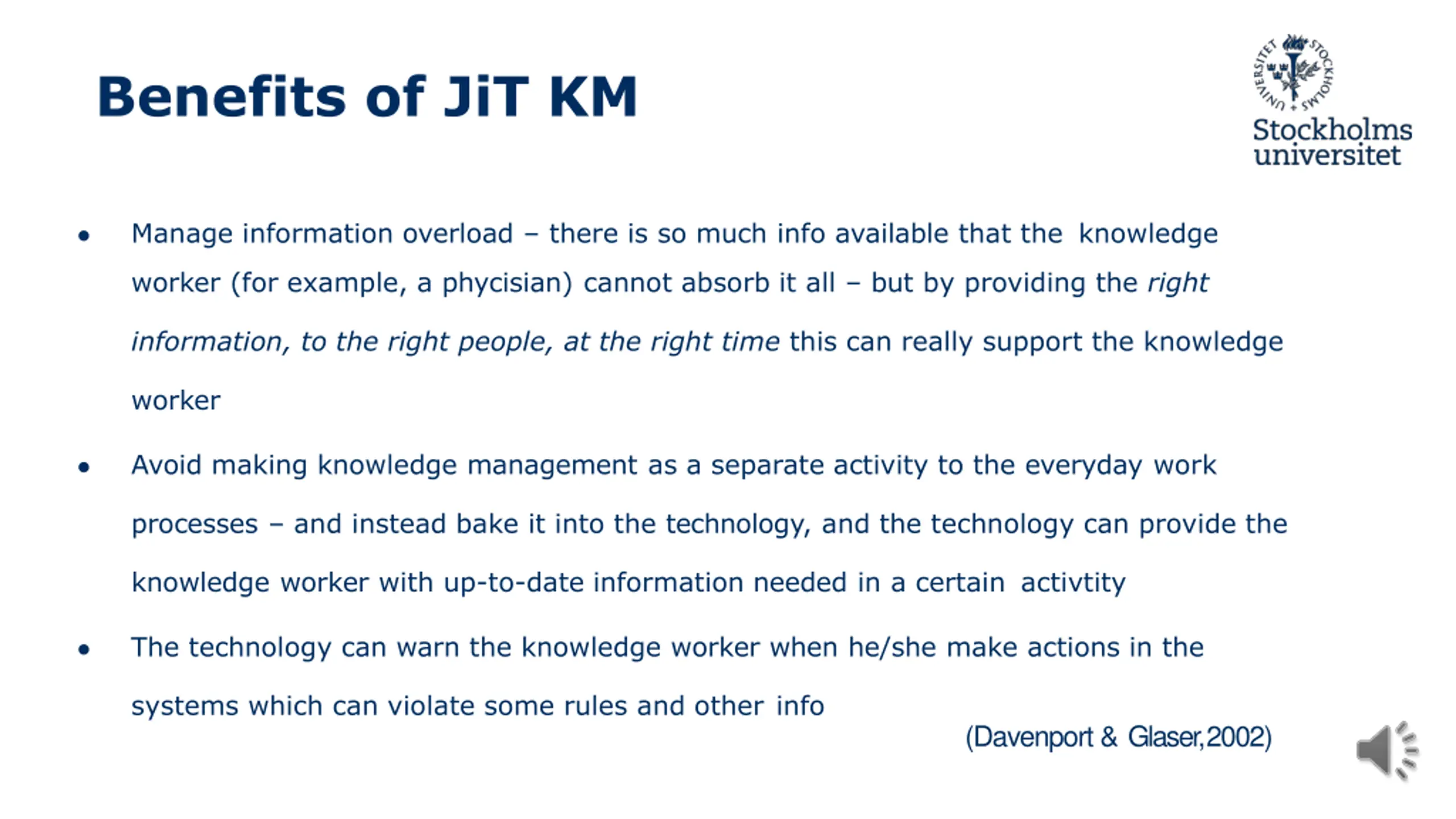 Benefits of JiT KM Manage information overload there is so much info available that the knowledge worker (for example, a phycisian) cannot absorb it all but by providing the right information, to the right people, at the right time this can really support the knowledge worker Avoid making knowledge management as a separate activity to the everyday work processes and instead bake it into the technology, and the technology can provide the knowledge worker with up-to-date information needed in a certain activtity The technology can warn the knowledge worker when he/she make actions in the systems which can violate some rules and other info (Davenport & Glaser,2002)