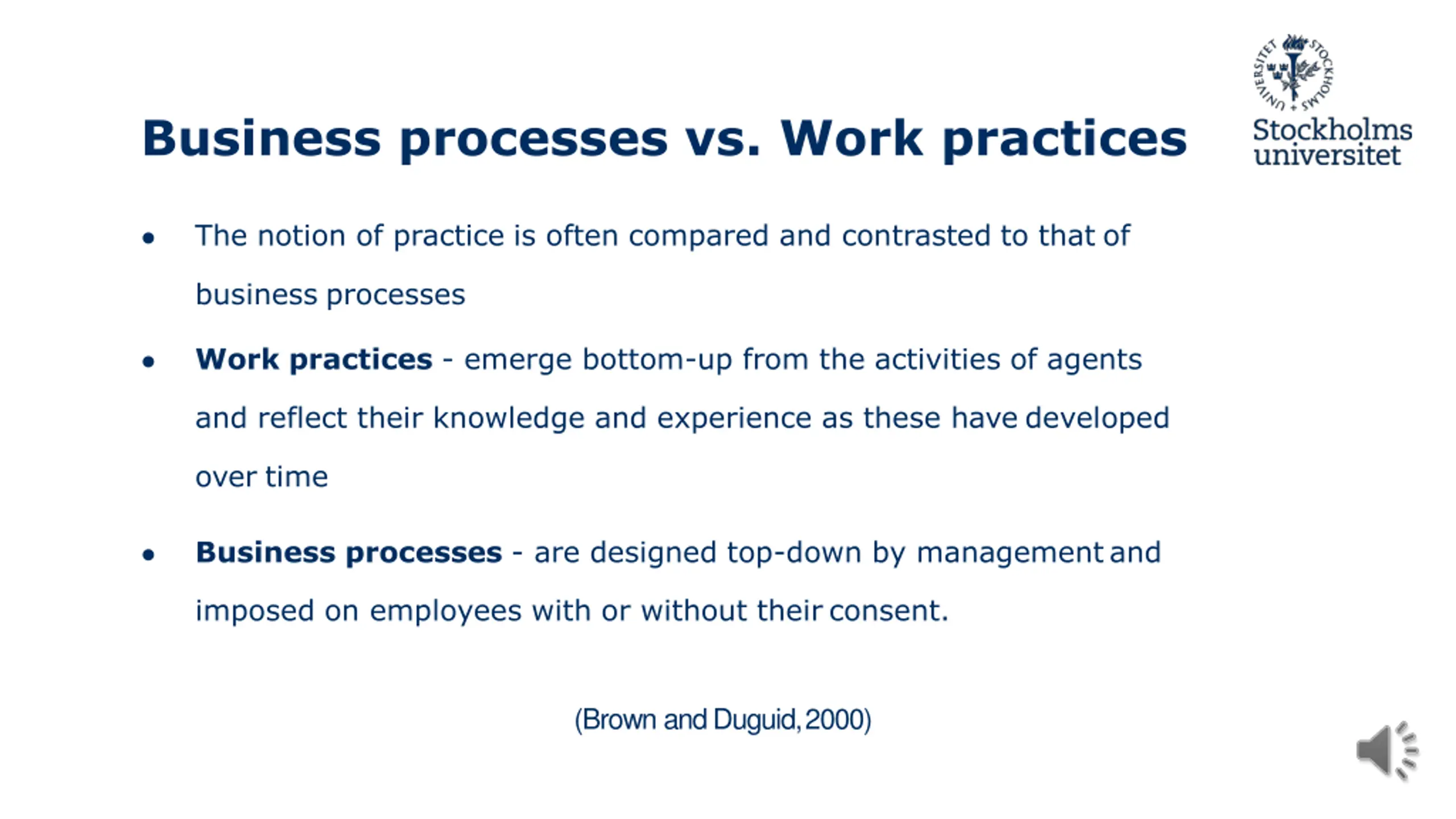 Business processes vs. Work practices The notion of practice is often compared and contrasted to that of business processes Work practices - emerge bottom-up from the activities of agents and reflect their knowledge and experience as these have developed over time Business processes - are designed top-down by managementand imposed on employees with or without their consent. (Brown and Duguid,2000)