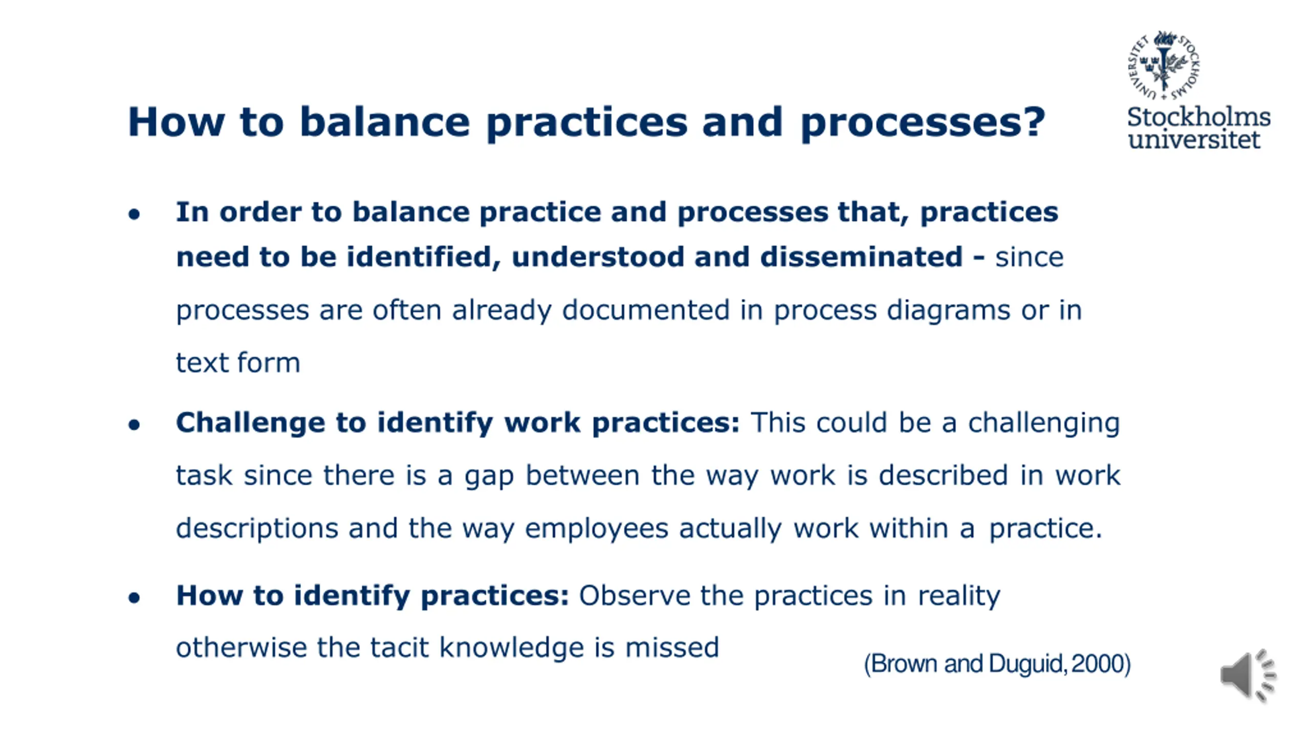 How to balance practices and processes? In order to balance practice and processes that, practices need to be identified, understood and disseminated - since processes are often already documented in process diagrams or in text form Challenge to identify work practices: This could be a challenging task since there is a gap between the way work is described in work descriptions and the way employees actually work within a practice. How to identify practices: Observe the practices in reality otherwise the tacit knowledge is missed (Brown and Duguid,2000)