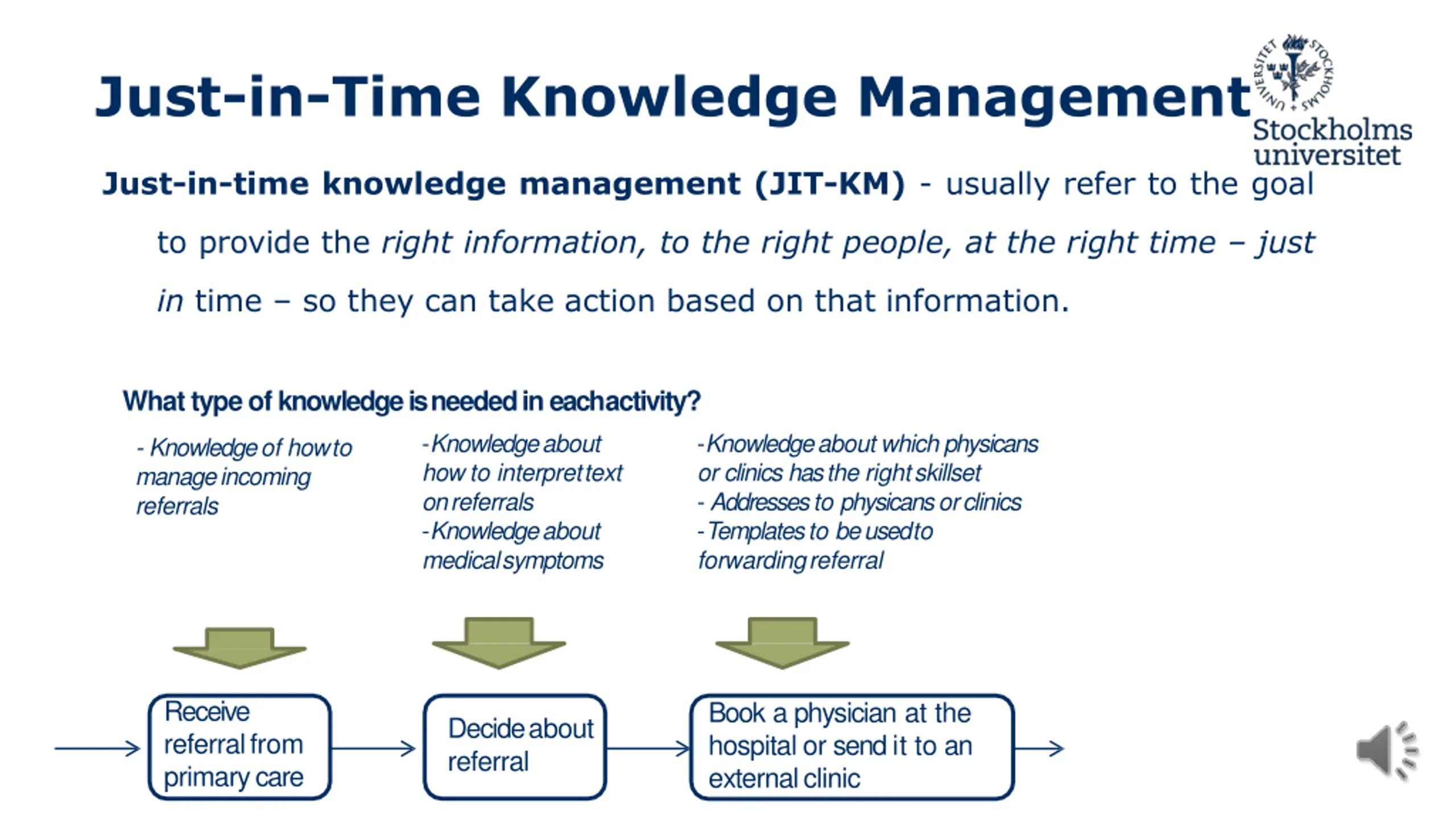Just-in-Time Knowledge Management Just-in-time knowledge management (JIT-KM) - usually refer to the goal to provide the right information, to the right people, at the right time just in time so they can take action based on that information. What type of knowledge is needed in eachactivity? -Knowledge about how to interprettext onreferrals -Knowledgeabout medicalsymptoms -Knowledge about which physicans or clinics has the rightskillset -Addresses to physicans orclinics -Templates to be usedto forwardingreferral - Knowledge of howto manage incoming referrals Receive referralfrom primarycare Book a physician at the hospital or sendit to an externalclinic Decideabout referral