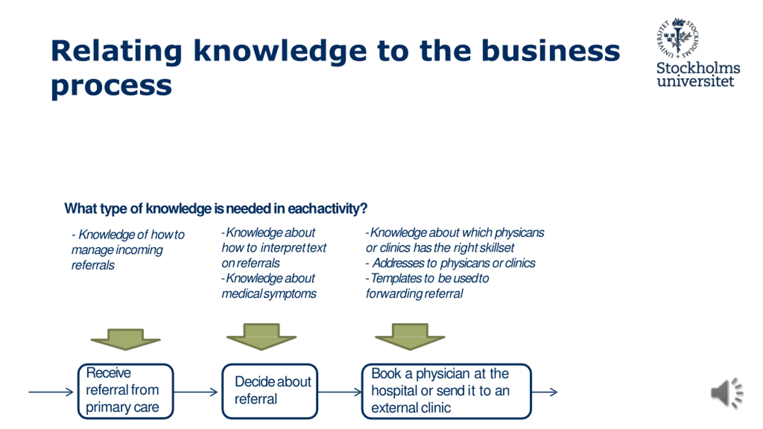 Relating knowledge to the business process What type of knowledge is needed in eachactivity? -Knowledge about how to interprettext onreferrals -Knowledgeabout medicalsymptoms -Knowledge about which physicans or clinics has the rightskillset -Addresses to physicans orclinics -Templates to be usedto forwardingreferral - Knowledge of howto manage incoming referrals Receive referralfrom primarycare Book a physician at the hospital or sendit to an externalclinic Decideabout referral