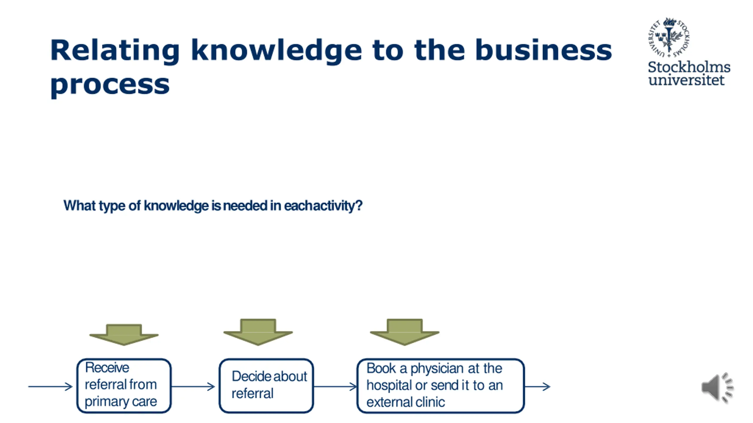 Relating knowledge to the business process What type of knowledge is needed in eachactivity? Receive referralfrom primarycare Book a physician at the hospital or sendit to an externalclinic Decideabout referral