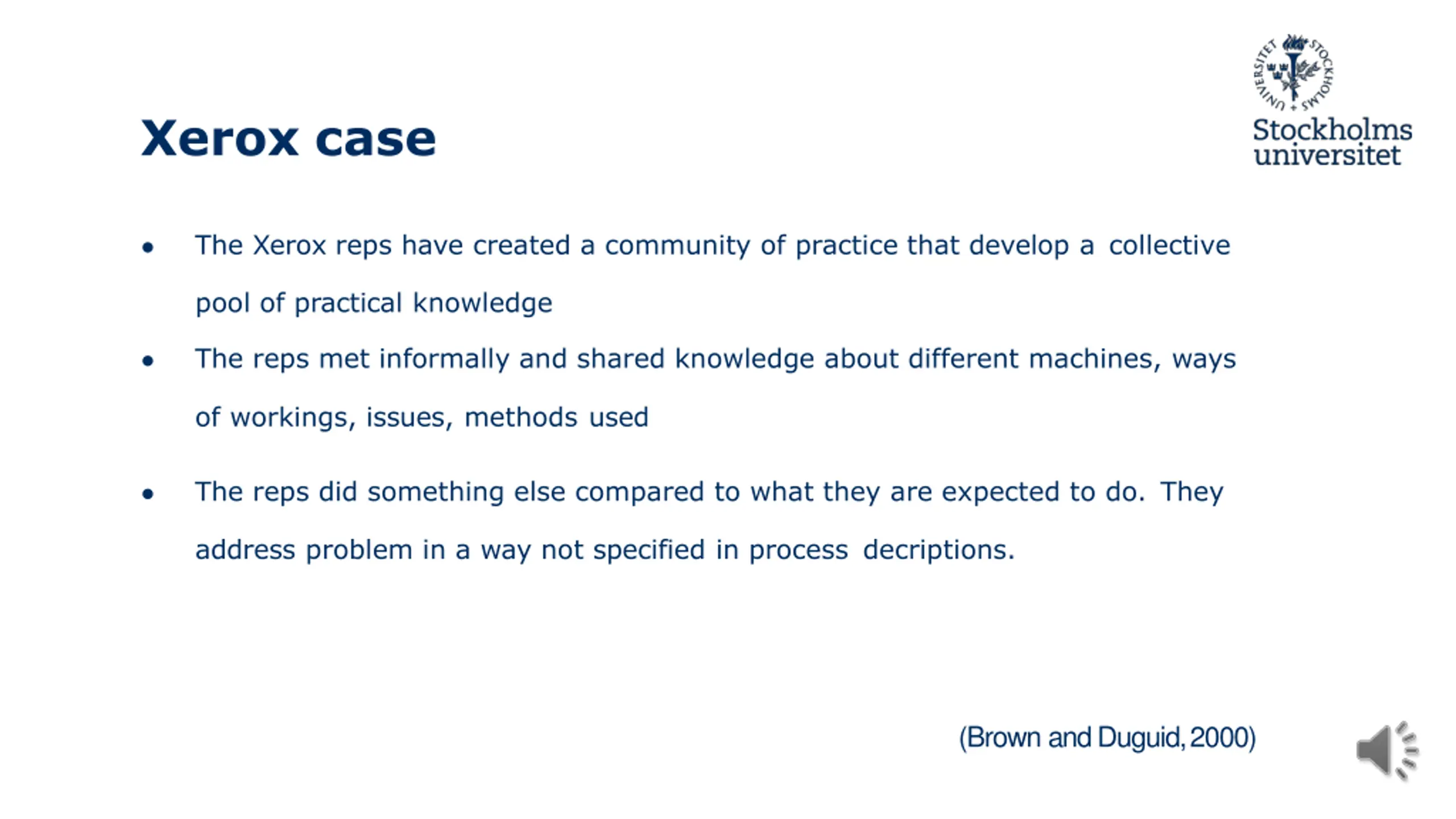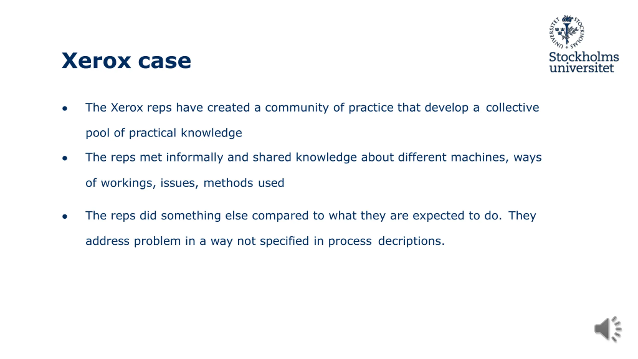 Xerox case The Xerox reps have created a community of practice that develop a collective pool of practical knowledge The reps met informally and shared knowledge about different machines, ways of workings, issues, methods used The reps did something else compared to what they are expected to do. They address problem in a way not specified in process decriptions.