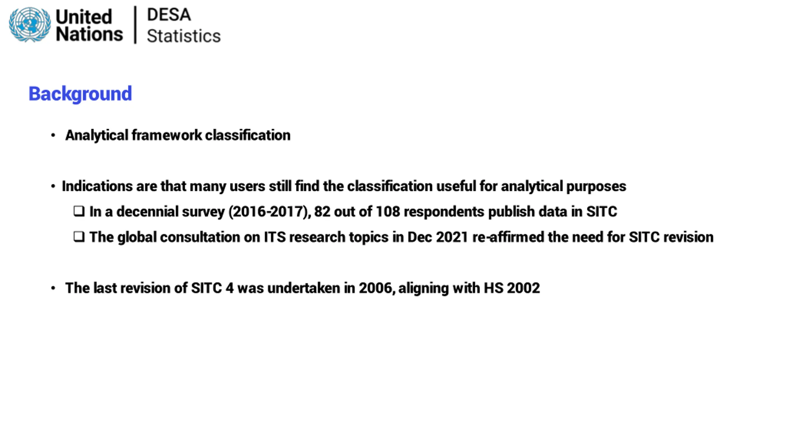 Background Analytical framework classification Indications are that many users still find the classification useful for analytical purposes In a decennial survey (2016-2017), 82 out of 108 respondents publish data in SITC The global consultation on ITS research topics in Dec 2021 re-affirmed the need for SITC revision The last revision of SITC 4 was undertaken in 2006, aligning with HS 2002