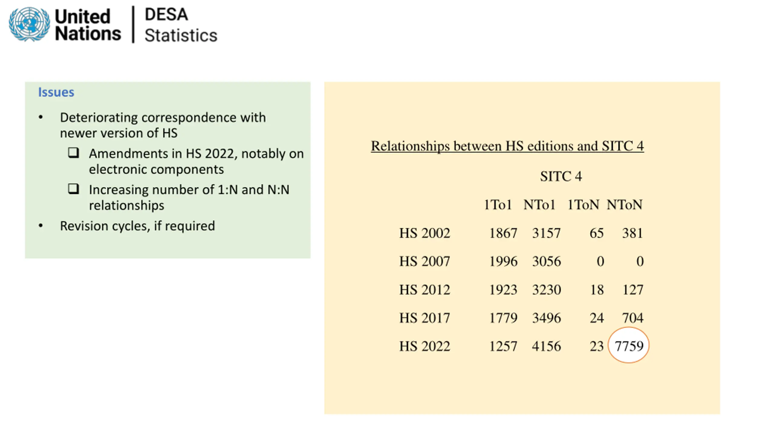 Issues Deteriorating correspondence with newer version of HS Amendments in HS 2022, notably on electronic components Increasing number of 1:N and N:N relationships Revision cycles, if required Relationships between HS editions and SITC 4 SITC 4 1To1 NTo1 1ToN NToN HS 2002 1867 3157 65 381 HS 2007 1996 3056 0 0 HS 2012 1923 3230 18 127 HS 2017 1779 3496 24 704 HS 2022 1257 4156 23 7759