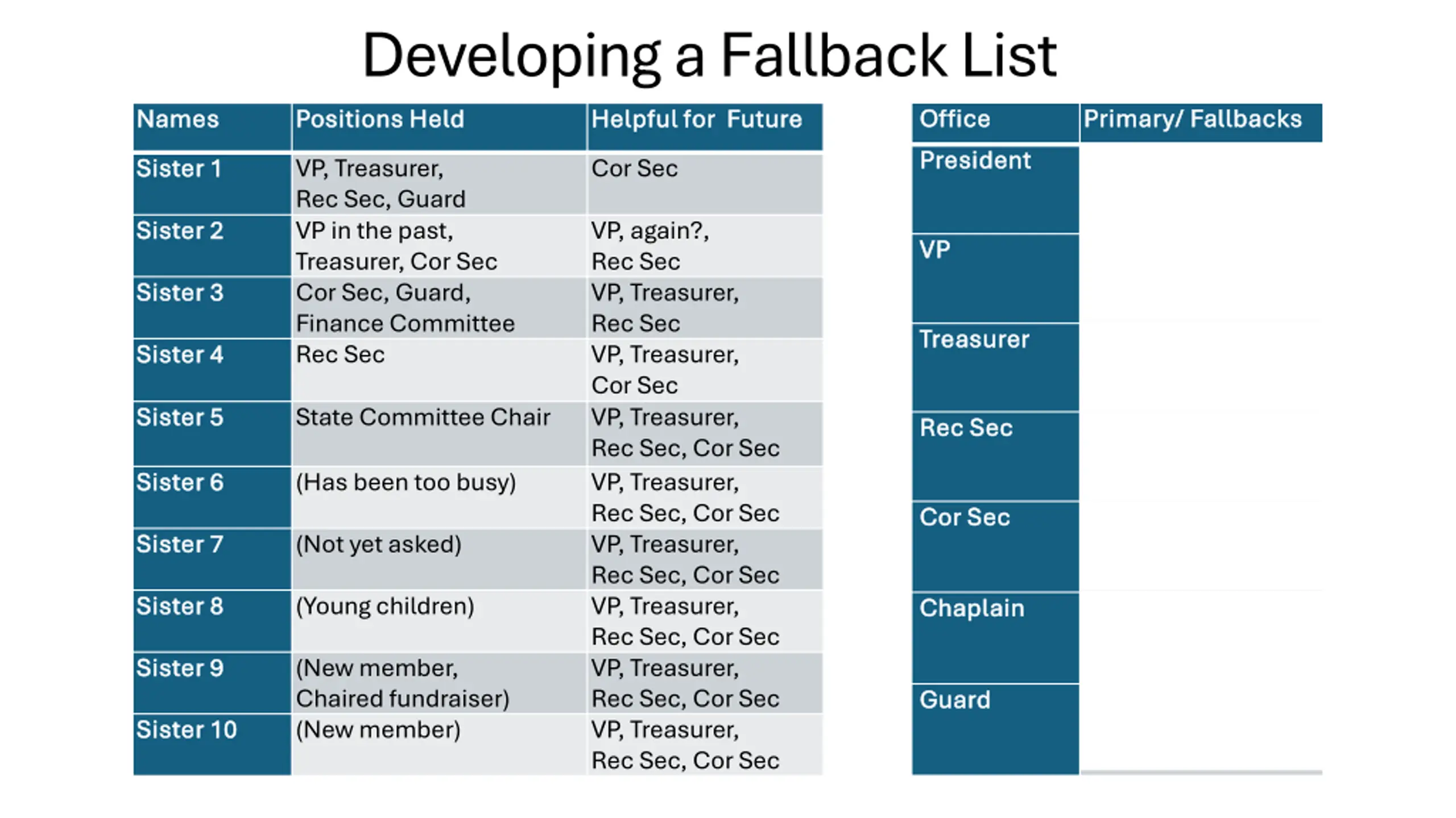 Developing a Fallback List Positions Held Positions Held Helpful for Future Helpful for Future Office Office President President Primary/ Fallbacks Primary/ Fallbacks Sister 1 (or Sister 2, 3) Names Names Sister 1 Sister 1 VP, Treasurer, Rec Sec, Guard VP in the past, Treasurer, Cor Sec Cor Sec, Guard, Finance Committee Rec Sec Cor Sec Sister 2 Sister 2 VP, again?, Rec Sec VP, Treasurer, Rec Sec VP, Treasurer, Cor Sec VP, Treasurer, Rec Sec, Cor Sec VP, Treasurer, Rec Sec, Cor Sec VP, Treasurer, Rec Sec, Cor Sec VP, Treasurer, Rec Sec, Cor Sec VP, Treasurer, Rec Sec, Cor Sec VP, Treasurer, Rec Sec, Cor Sec VP VP Sister 2 (or Sister 3, 4) Sister 3 Sister 3 Treasurer Treasurer Sister 3 (or Sister 4, 5, 6) Sister 4 Sister 4 Sister 5 Sister 5 State Committee Chair Rec Sec Rec Sec Sister 5 (or Sister 6, 7, 8) Sister 6 Sister 6 (Has been too busy) Cor Sec Cor Sec Sister 4 (or Sister 6, 7, 8) Sister 7 Sister 7 (Not yet asked) Sister 8 Sister 8 (Young children) Chaplain Chaplain Sister 6 (or Sister 7, 8, 9) Sister 9 Sister 9 (New member, Chaired fundraiser) (New member) Guard Guard Sister 7 (or Sister 8, 9,10) Sister 10 Sister 10 Names Names Positions Held Positions Held Helpful for Future Helpful for Future