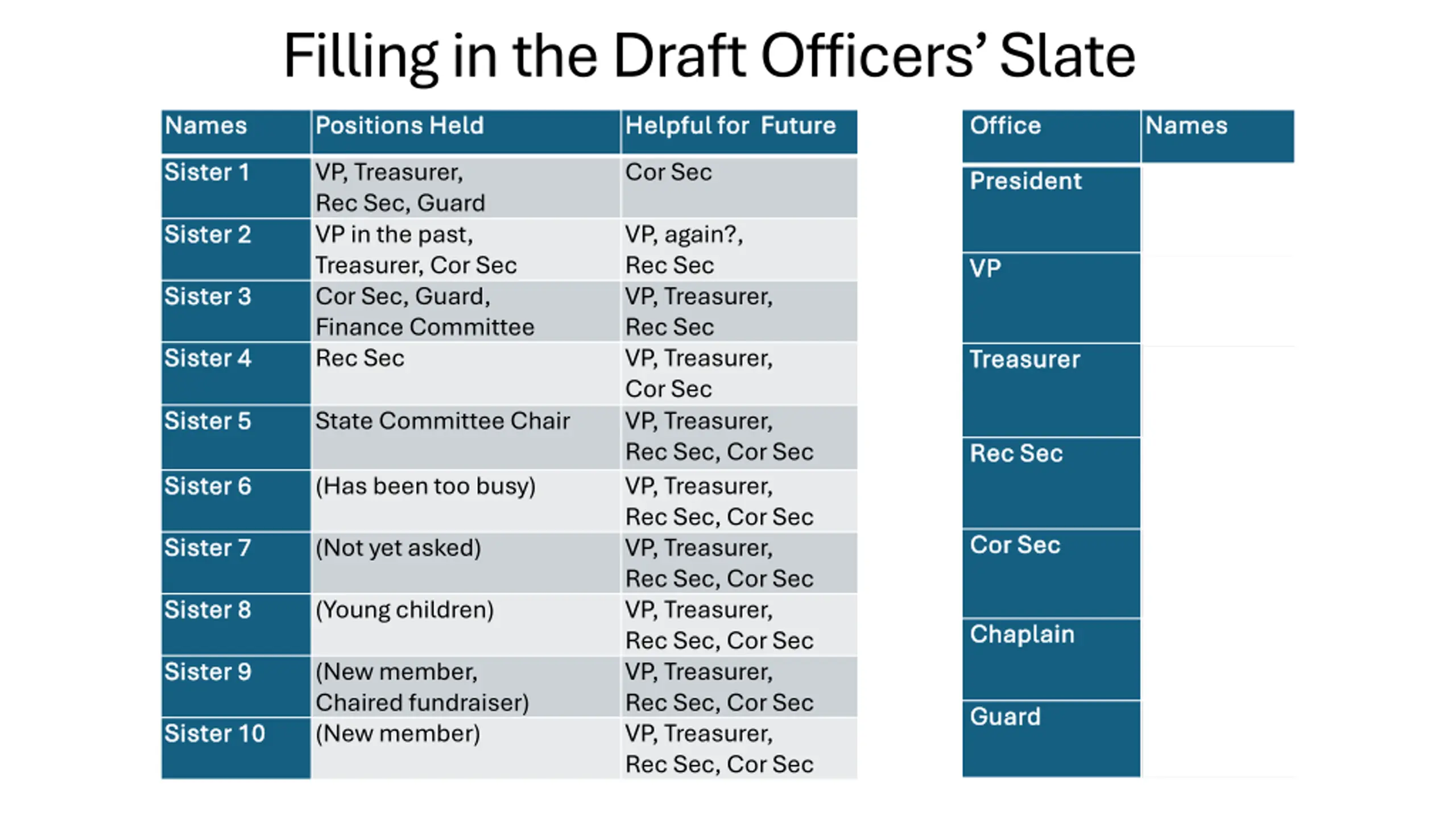 Filling in the Draft Officers Slate Names Names Positions Held Positions Held Helpful for Future Helpful for Future Office Office Names Names Sister 1 Sister 1 VP, Treasurer, Rec Sec, Guard VP in the past, Treasurer, Cor Sec Cor Sec, Guard, Finance Committee Rec Sec Cor Sec President President Sister 1 Sister 2 Sister 2 VP, again?, Rec Sec VP, Treasurer, Rec Sec VP, Treasurer, Cor Sec VP, Treasurer, Rec Sec, Cor Sec VP, Treasurer, Rec Sec, Cor Sec VP, Treasurer, Rec Sec, Cor Sec VP, Treasurer, Rec Sec, Cor Sec VP, Treasurer, Rec Sec, Cor Sec VP, Treasurer, Rec Sec, Cor Sec VP VP Sister 2 Sister 3 Sister 3 Sister 4 Sister 4 Treasurer Treasurer Sister 3 Sister 5 Sister 5 State Committee Chair Rec Sec Rec Sec Sister 5 Sister 6 Sister 6 (Has been too busy) Cor Sec Cor Sec Sister 4 Sister 7 Sister 7 (Not yet asked) Sister 8 Sister 8 (Young children) Chaplain Chaplain Sister 6 Sister 9 Sister 9 (New member, Chaired fundraiser) (New member) Guard Guard Sister 7 Names Names Positions Held Positions Held Helpful for Future Helpful for Future Sister 10 Sister 10