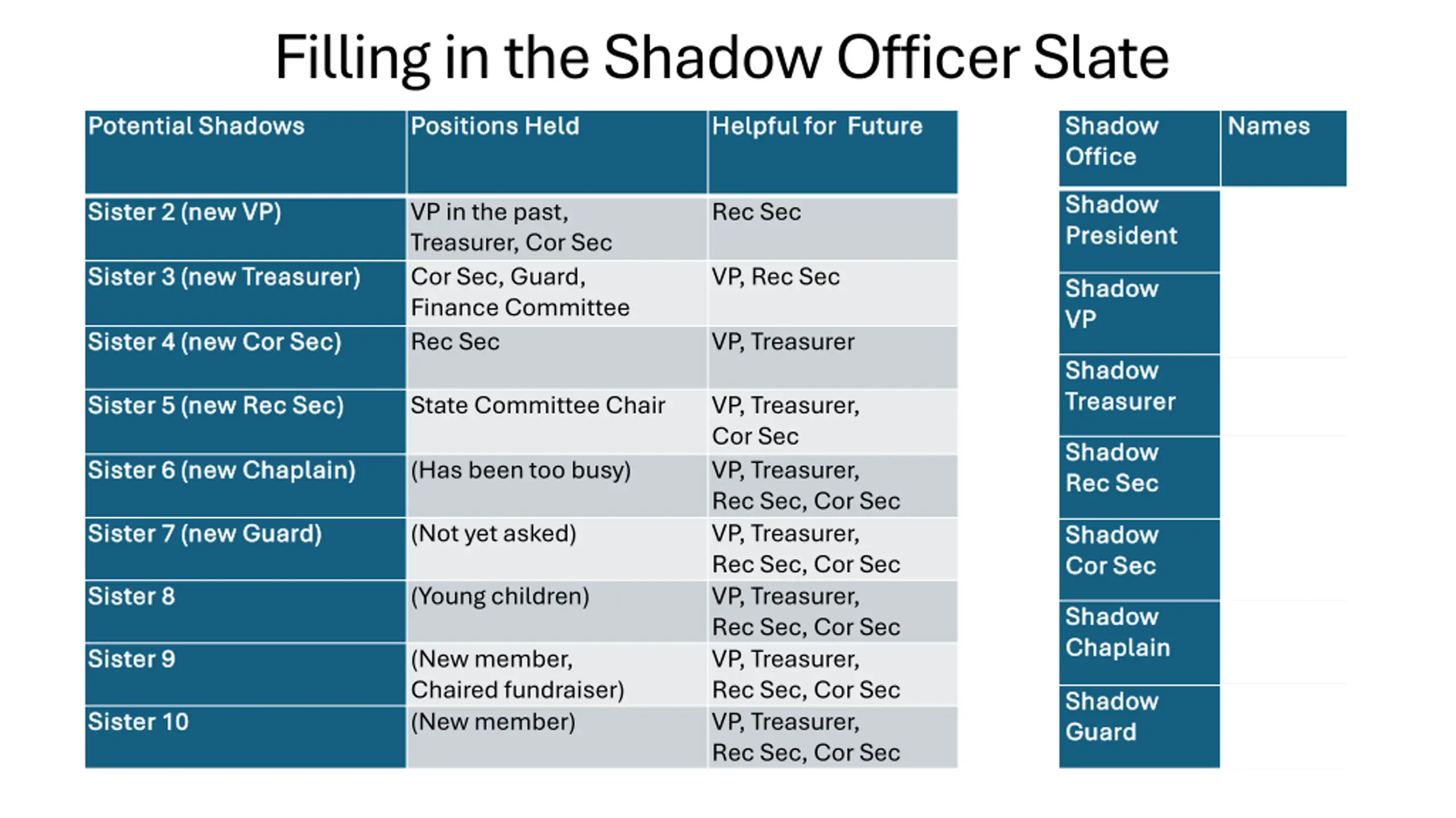 Filling in the Shadow Officer Slate Potential Shadows Potential Shadows Positions Held Positions Held Helpful for Future Helpful for Future Shadow Shadow Office Office Names Names Shadow Shadow President President Sister 2 Sister 2 (new VP) Sister 2 (new VP) VP in the past, Treasurer, Cor Sec Cor Sec, Guard, Finance Committee Rec Sec Rec Sec Sister 3 (new Treasurer) Sister 3 (new Treasurer) VP, Rec Sec Shadow Shadow VP VP Sister 3 Sister 4 (new Cor Sec) Sister 4 (new Cor Sec) VP, Treasurer Shadow Shadow Treasurer Treasurer Sister 5 Sister 5 (new Rec Sec) Sister 5 (new Rec Sec) State Committee Chair VP, Treasurer, Cor Sec VP, Treasurer, Rec Sec, Cor Sec VP, Treasurer, Rec Sec, Cor Sec VP, Treasurer, Rec Sec, Cor Sec VP, Treasurer, Rec Sec, Cor Sec VP, Treasurer, Rec Sec, Cor Sec Shadow Shadow Rec Sec Rec Sec Sister 8 Sister 6 (new Chaplain) Sister 6 (new Chaplain) (Has been too busy) Sister 7 (new Guard) Sister 7 (new Guard) (Not yet asked) Shadow Shadow Cor Sec Cor Sec Sister 9 Sister 8 Sister 8 (Young children) Shadow Shadow Chaplain Chaplain Sister 4 Sister 9 Sister 9 (New member, Chaired fundraiser) (New member) Shadow Shadow Guard Guard Sister 10 Sister 10 Sister 10