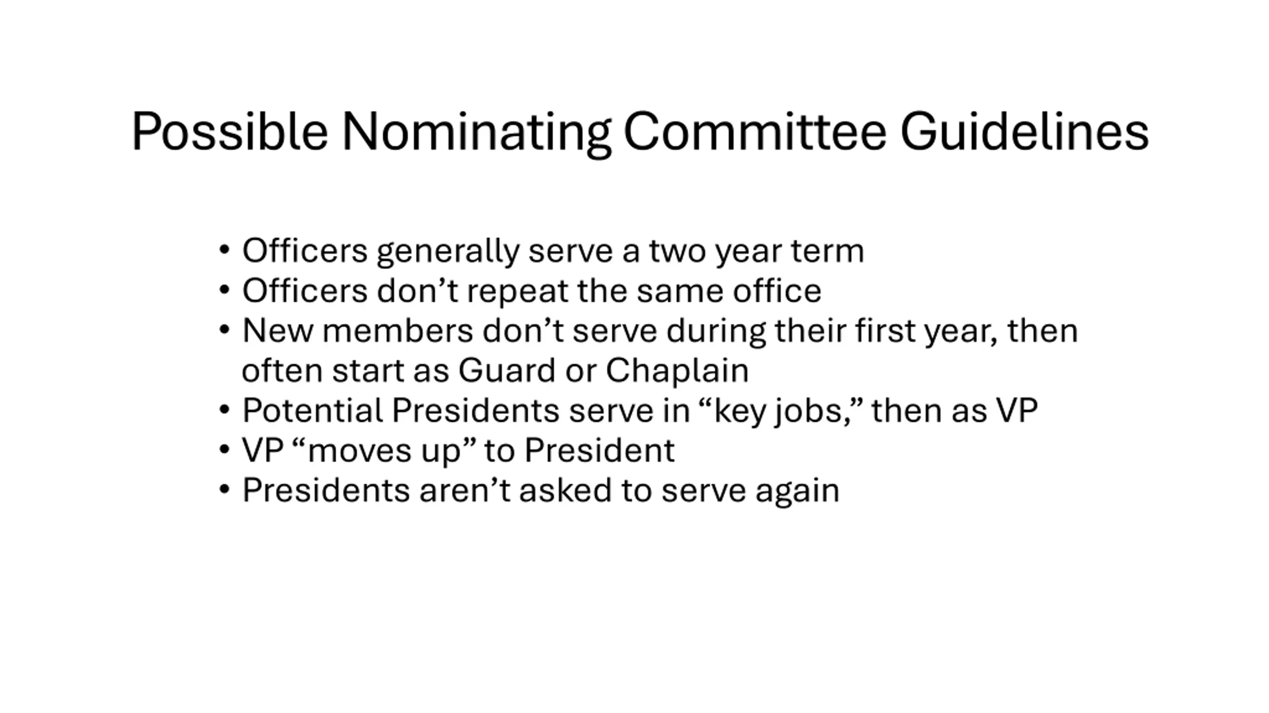 Possible Nominating Committee Guidelines Officers generally serve a two year term Officers don t repeat the same office New members don t serve during their first year, then often start as Guard or Chaplain Potential Presidents serve in key jobs, then as VP VP moves up to President Presidents aren t asked to serve again