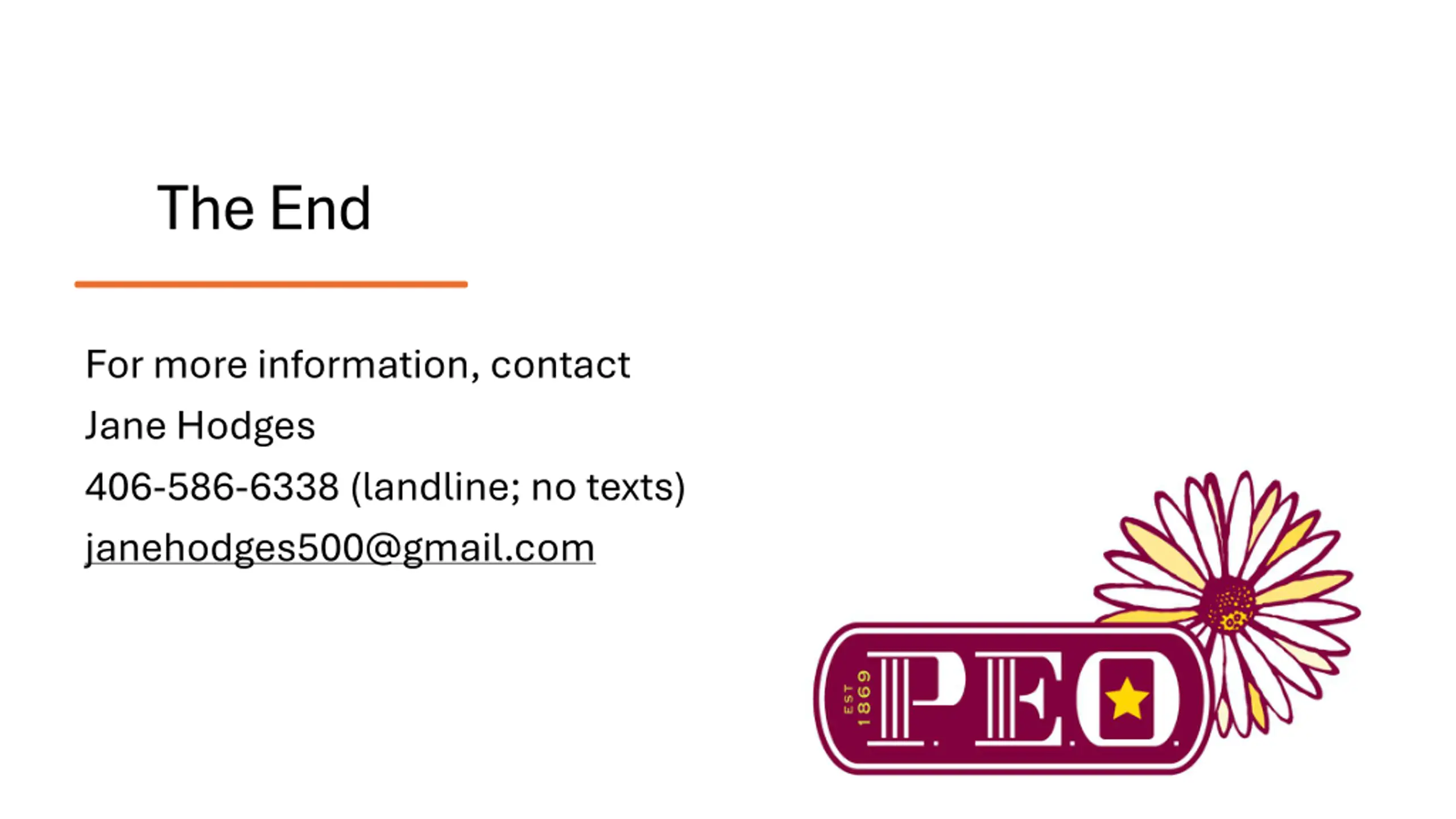 The End For more information, contact Jane Hodges 406-586-6338 (landline; no texts) janehodges500@gmail.com