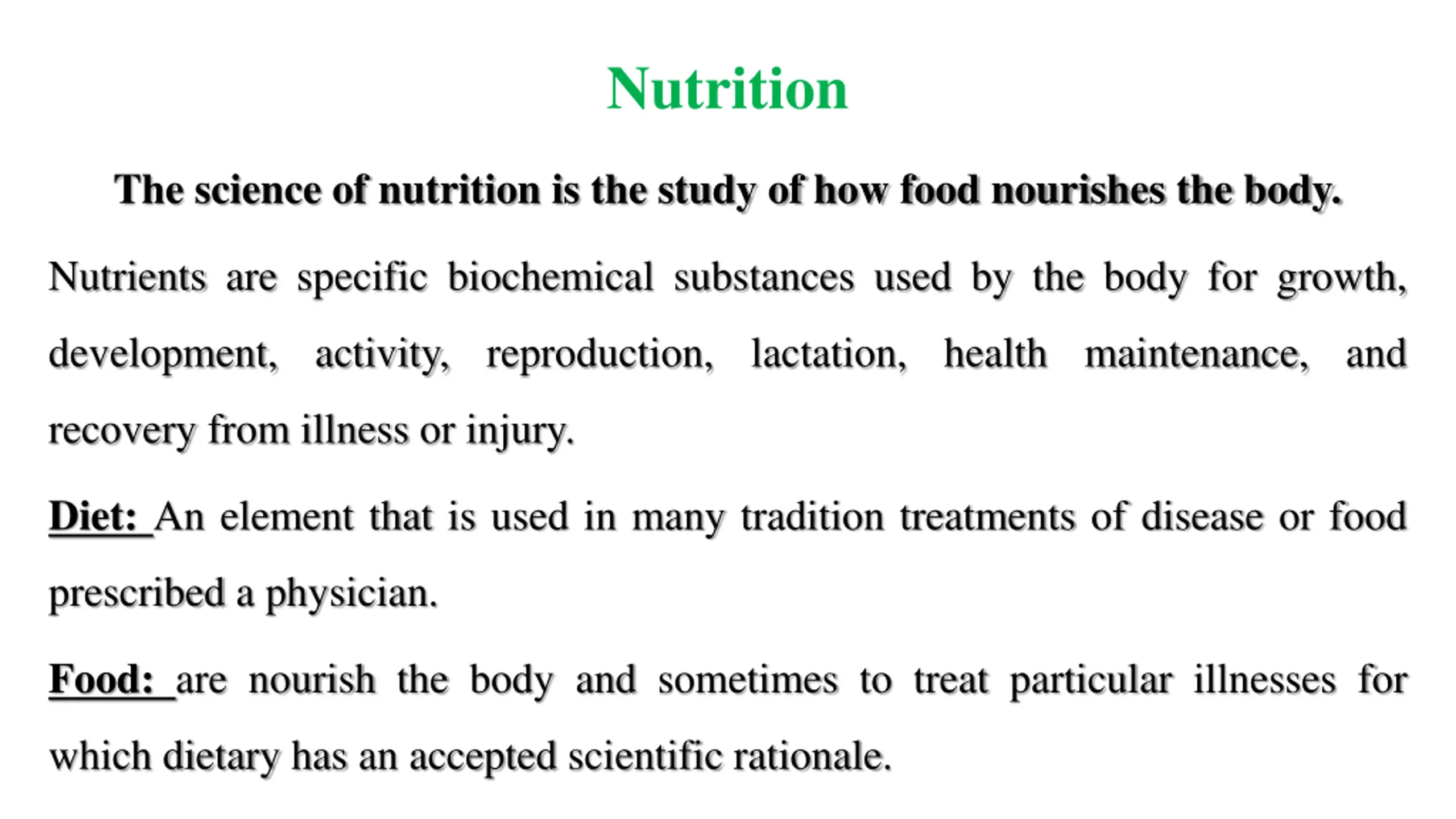 Nutrition The science of nutrition is the study of how food nourishes the body. Nutrients are specific biochemical substances used by the body for growth, development, activity, reproduction, lactation, health maintenance, and recovery from illness or injury. Diet: An element that is used in many tradition treatments of disease or food prescribed a physician. Food: are nourish the body and sometimes to treat particular illnesses for which dietary has an accepted scientific rationale.