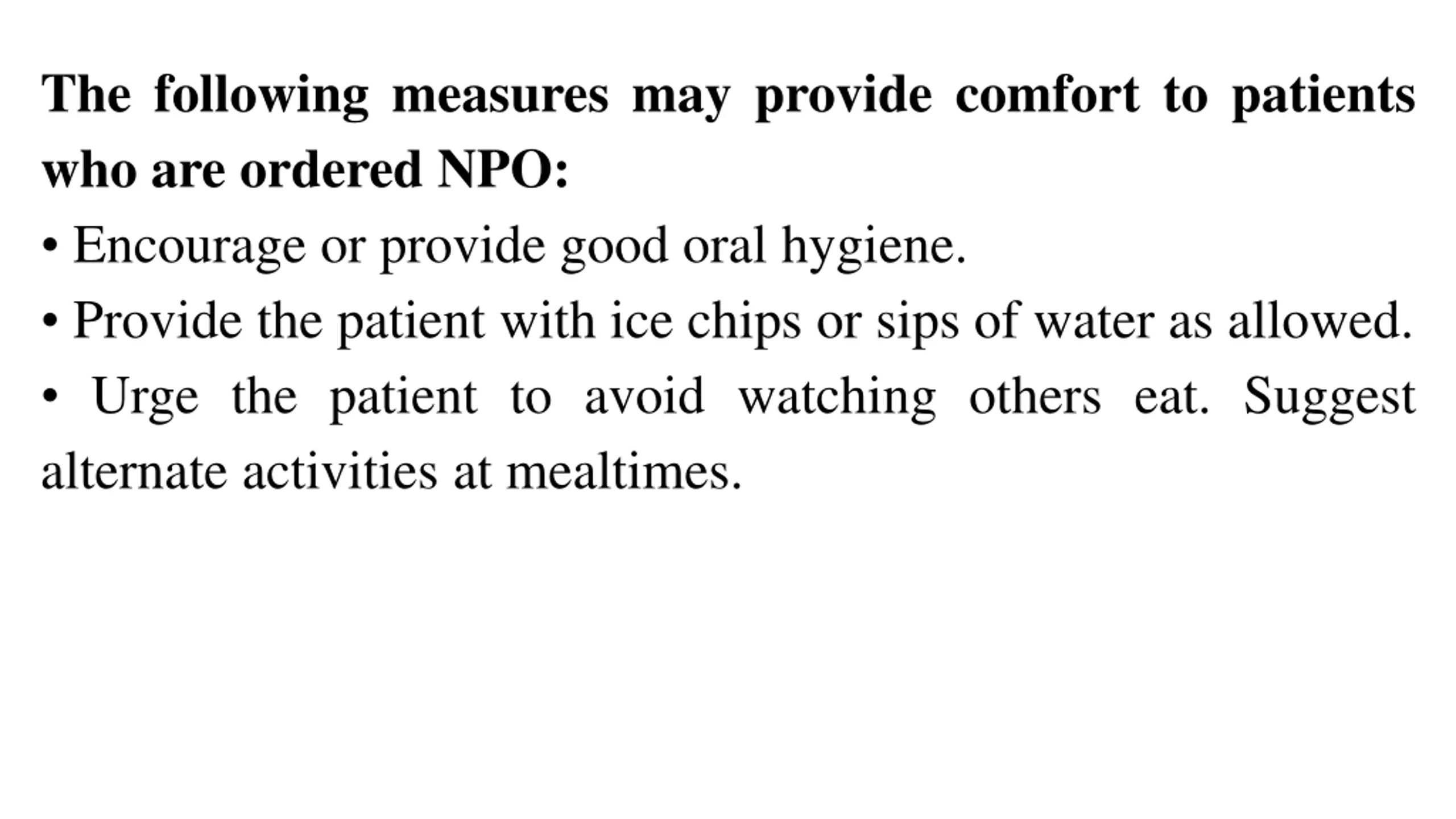 The following measures may provide comfort to patients who are ordered NPO: Encourage or provide good oral hygiene. Provide the patient with ice chips or sips of water as allowed. Urge the patient to avoid watching others eat. Suggest alternate activities at mealtimes.