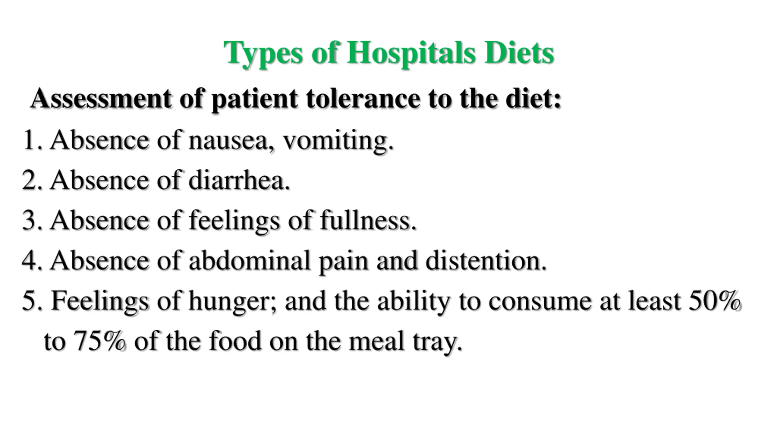 Types of Hospitals Diets Assessment of patient tolerance to the diet: 1. Absence of nausea, vomiting. 2. Absence of diarrhea. 3. Absence of feelings of fullness. 4. Absence of abdominal pain and distention. 5. Feelings of hunger; and the ability to consume at least 50% to 75% of the food on the meal tray.