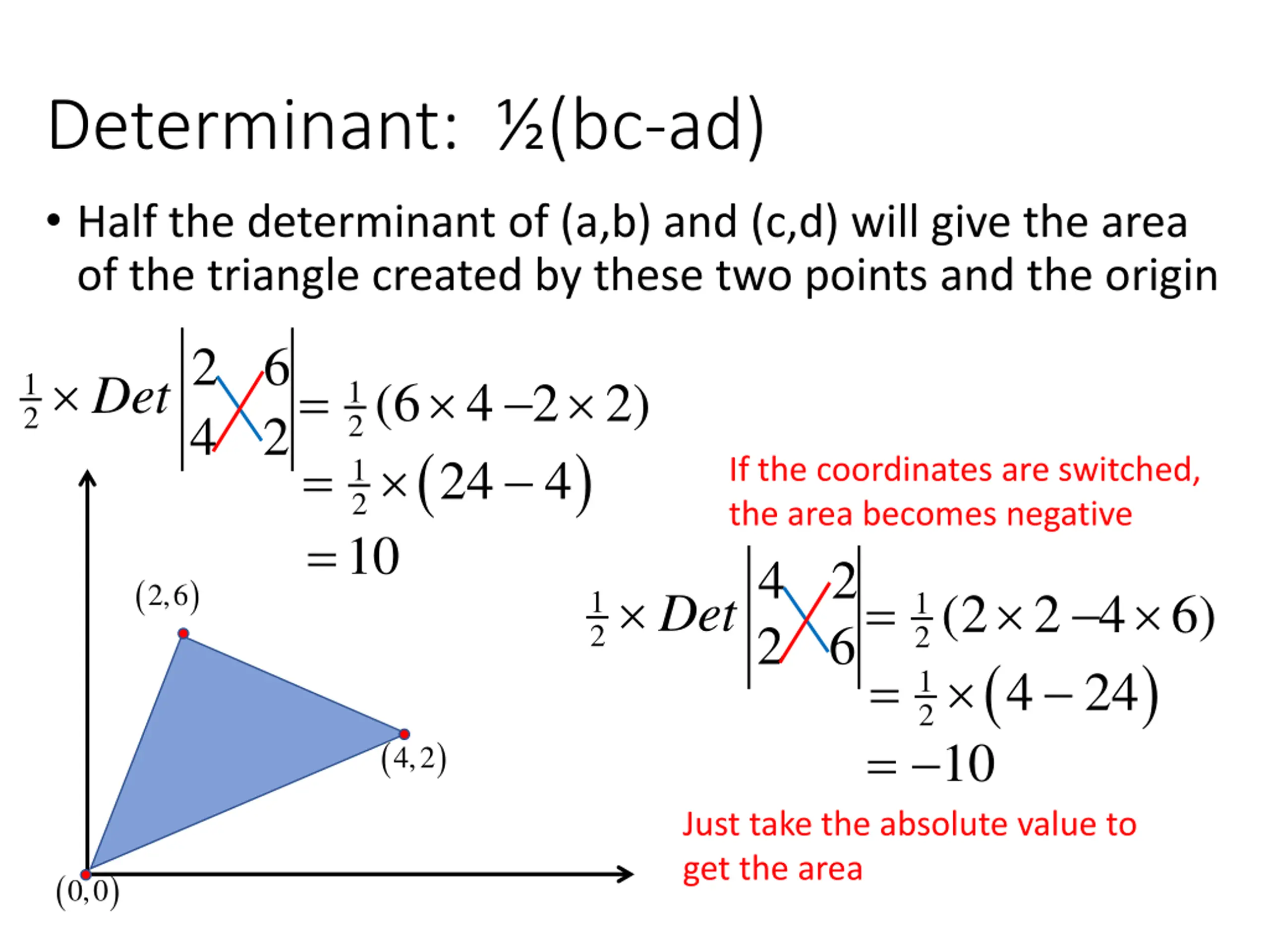 Determinant: (bc-ad) Half the determinant of (a,b) and (c,d) will give the area of the triangle created by these two points and the origin 2 6 4 2 Det 1 2 = 2 2) 24 ) 1 2(6 4 ( 2 = 10 = 4 1 If the coordinates are switched, the area becomes negative 4 2 2 6 1 2 = 10 = Just take the absolute value to get the area ( ) 2,6 = 4 6) 4 24 ) Det 1 2(2 2 ( 1 2 ( ) 4,2 ( ) 0,0