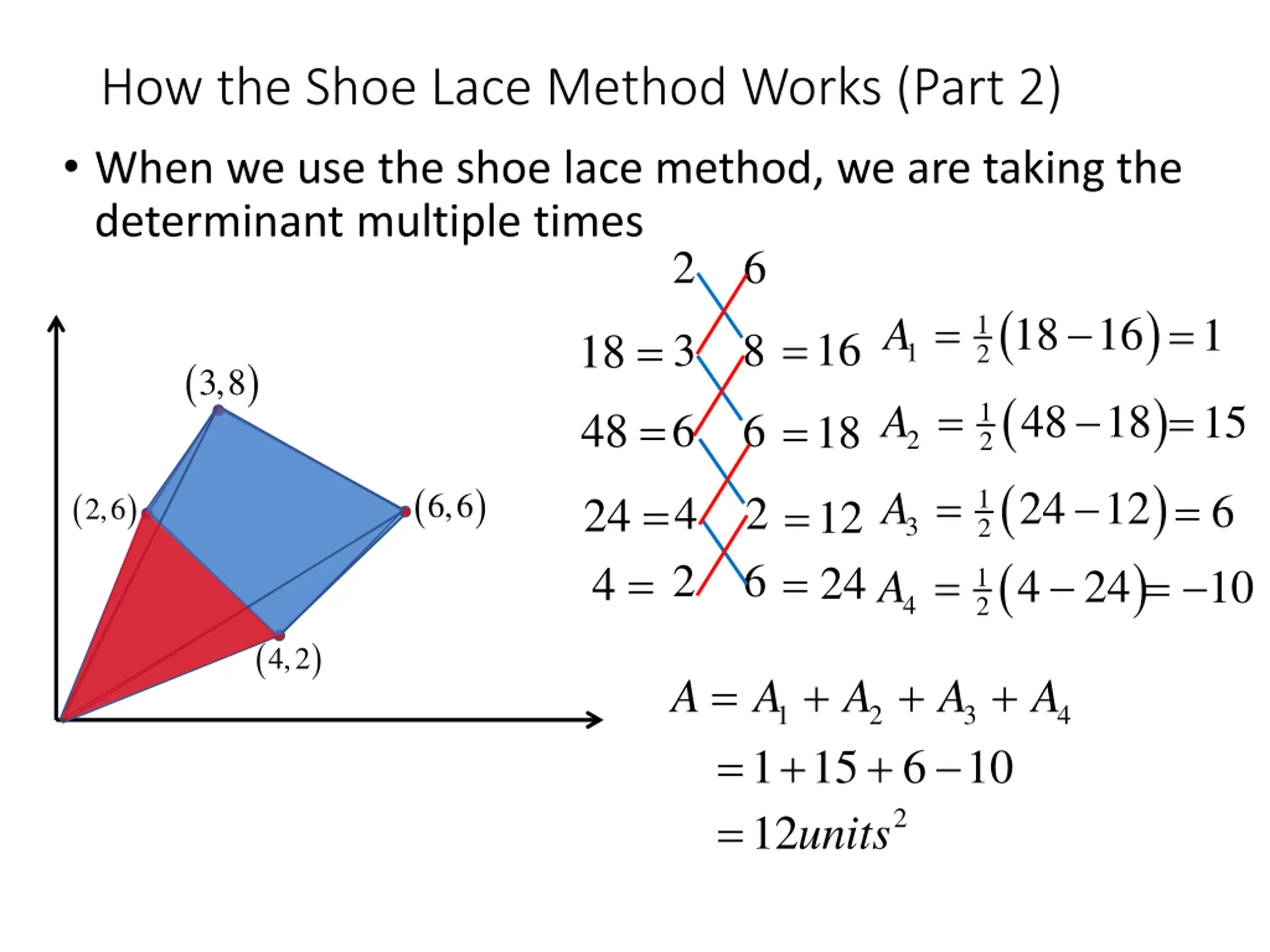 How the Shoe Lace Method Works (Part 2) When we use the shoe lace method, we are taking the determinant multiple times 2 6 ( ( ( ( ) ) ) = A = = 1 218 16 1 = 18 = 48 = 16 3 8 1 ( ) 3,8 A = = 1 248 18 15 = 6 6 18 2 ( ) A = A = = 1 224 12 ( ) 24 = 4 = 6 10 6,6 = = 4 2 2 6 12 24 2,6 3 ) 1 24 24 4 ( ) 4,2 = + + 6 10 + A A 1 15 = + 12units = A A A 1 2 + 2 3 4