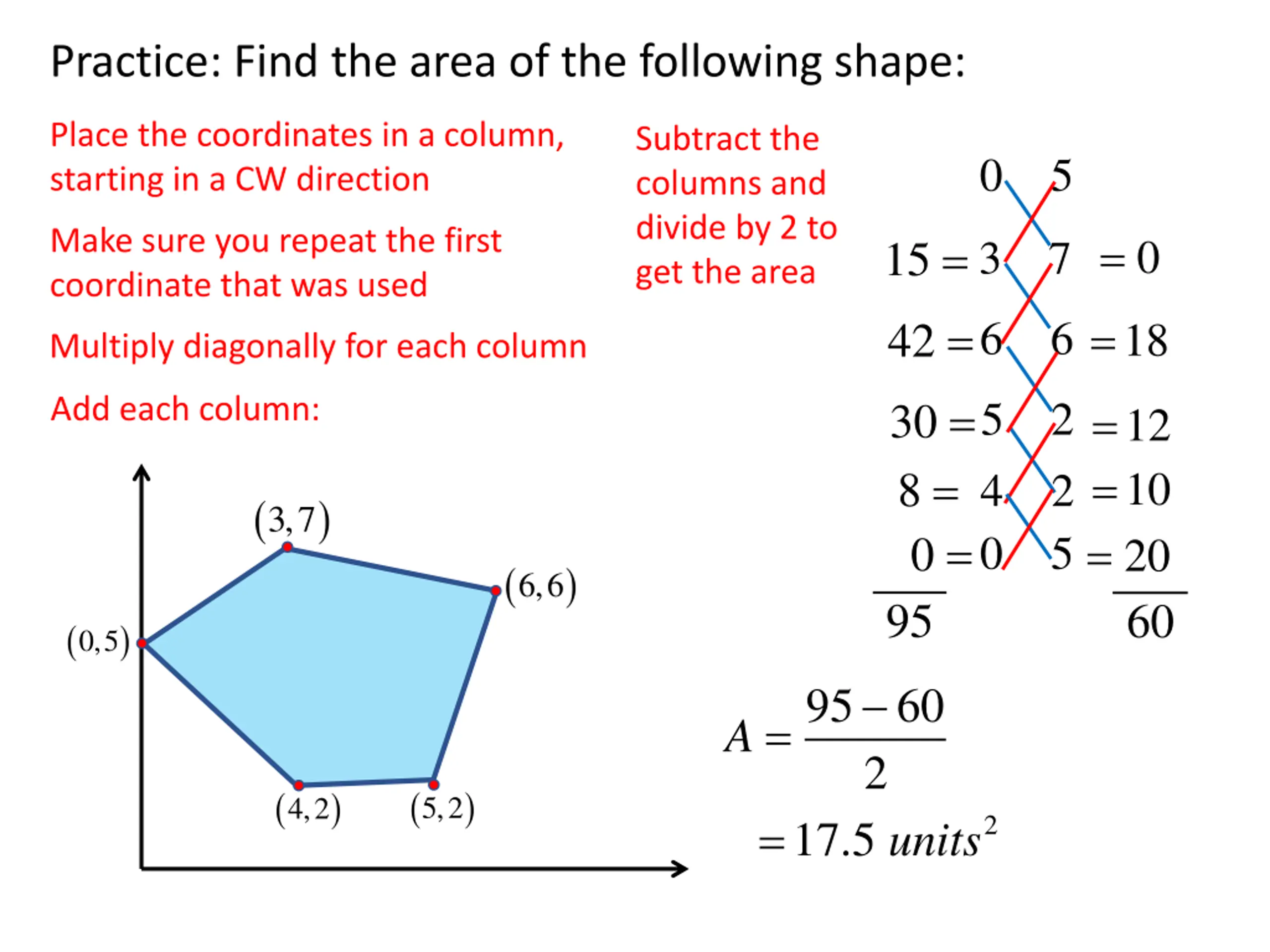 Practice: Find the area of the following shape: Place the coordinates in a column, starting in a CW direction Subtract the columns and divide by 2 to get the area 0 5 Make sure you repeat the first coordinate that was used = 15 = 42 = 30 = 8 = 0 = 0 3 7 = 6 6 18 Multiply diagonally for each column 5 2 4 2 0 5 Add each column: = = = 12 10 20 ( ) 3,7 ( ) 6,6 95 60 ( ) 0,5 95 60 = A 2 ( ) ( ) 5,2 4,2 = 2 17.5 units