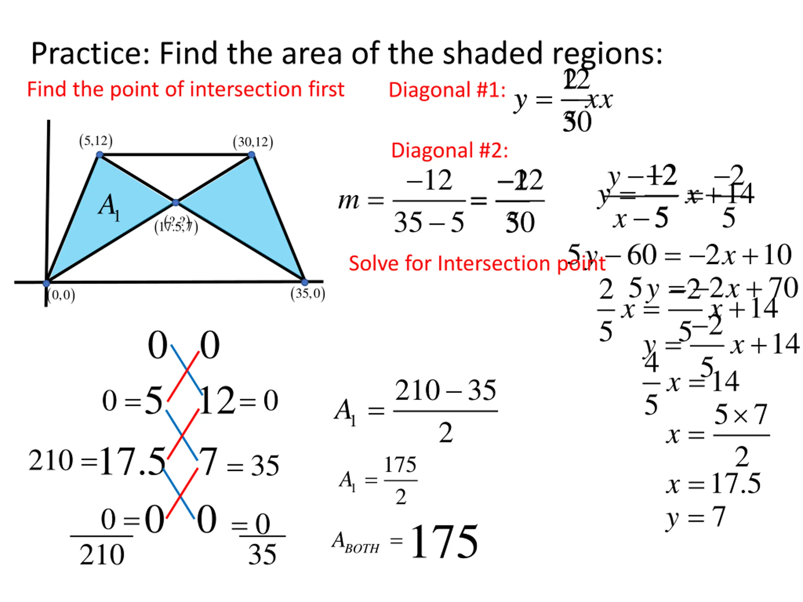 Practice: Find the area of the shaded regions: Find the point of intersection first =2 = 12 30 5 Diagonal #1: y y x x ( ) ( ) 5,12 30,12 Diagonal #2: 12 35 5 = 2 12 5 60 5 y x = 2 14 y x 2 5 12 30 5 2 + = x y = = = m 1A 5 5 x x + ( ) ?,? ( ) 17.5,7 = = 2 5 5x = x + 5 2 2 2 5 14 5 7 = x = 7 y = 10 70 + 14 y Solve for Intersection point ( ) ( ) 35,0 0,0 x 0 0 5 12 = + 14 y 4 x 210 35 = 0 = 0 = A 1 2 17.5 7 0 0 0 = 210 2 210 = = 35 175 2 A = 17.5 1 = 35 0 175 2 175 = 2 BOTH A